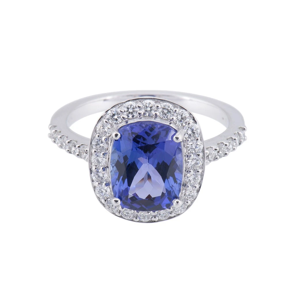 Chisholm Hunter 14ct White Gold Cushion Cut Tanzanite 2.05ct Diamond Halo Ring