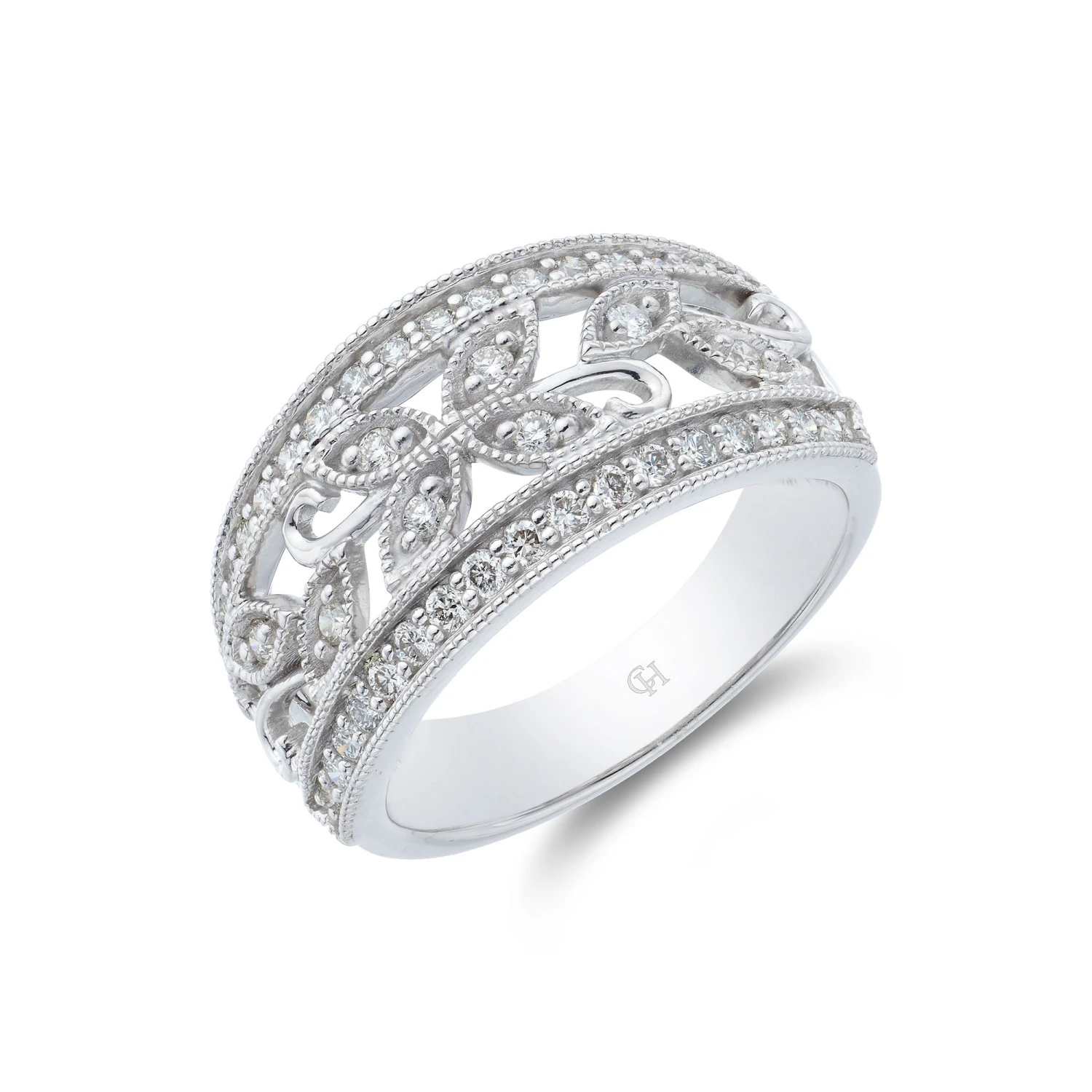 Vintage-inspired floral fancy band ring is embellished with 0.50ct of round brilliant diamonds. The diamonds are set within a 9ct white gold setting with beading detailing to add a glint of Art-Deco glamour. This ring tappers in its design with two outer rows with an inner floral open pattern. The floral fill of the ring are alethically pleasing in its position of the floral petals creating a focal point at the centre of the bangle. Complete any ensemble with this glistening vintage floral piece. Expand your collection with our matching bangle and ring in this collection. Each piece from our 1857 collection is specially designed and inspired by our proud family-run heritage: a collection for present and future generations. Diamond Information; Cut- Round Brilliant. Colour- J-L, Clarity- I1, Carat Weight- 0.50ct.