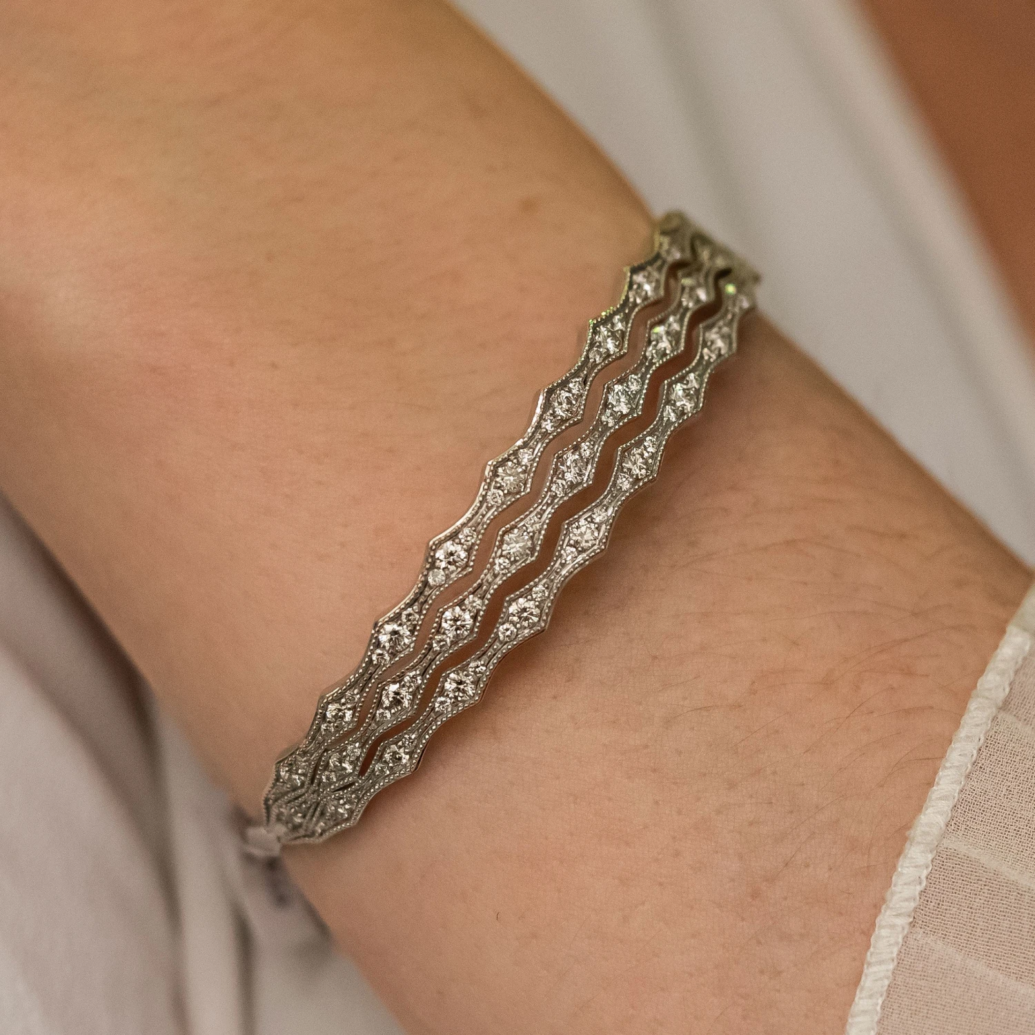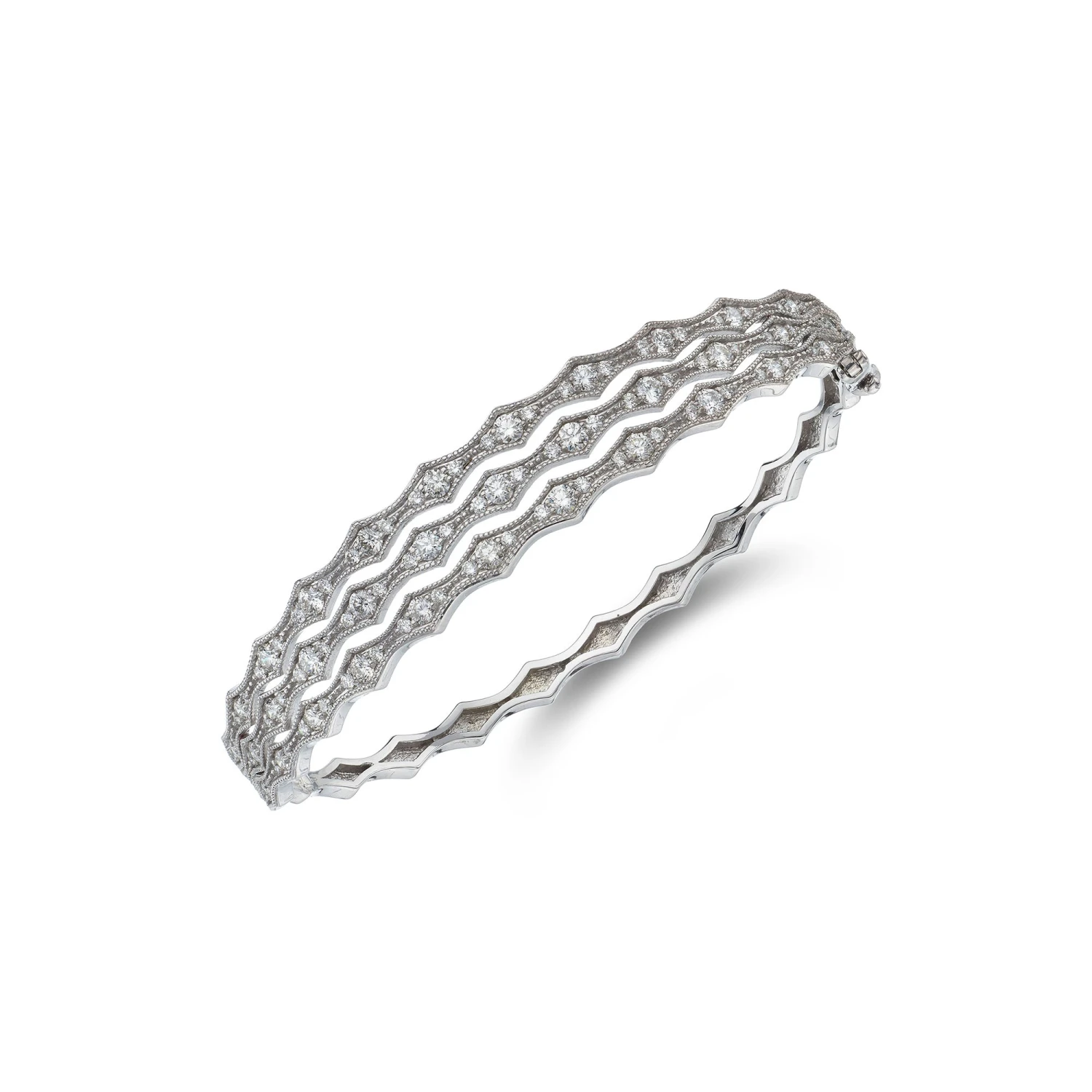 To complete the set, this exquisite 3 row lattice bangle is perfect. The bangle is embellished with three lattice design rows of round brilliant diamonds. The softness and sophistication of this bangle makes a unique diamond addition to your collection. The 1.00ct of round brilliant diamonds are set in 9ct white gold with beading to finish the vintage-inspired design with the use of the vector line art. A lovely addition to this vintage collection. Each piece from our 1857 collection is specially designed and inspired by our proud family-run heritage: a collection for present and future generations. Diamond Information: Cut- Round Brilliant, Colour- J-L, Clarity- I1, Carat Weight- 1.00ct.