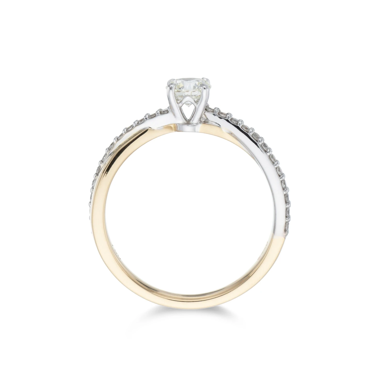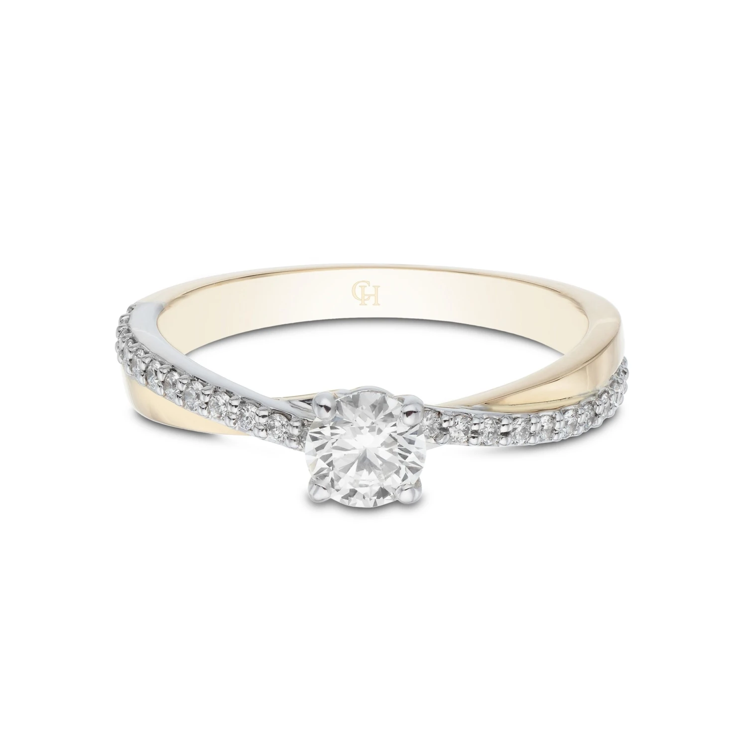 This 18ct 2 Colour Brilliant Cut 0.33ct Diamond Solitaire Ring from Chisholm Hunter will fit effortlessly into any jewellery box. The brilliant cut diamond and supporting diamond shoulders perfectly contrast the elegant yellow gold ring that boasts a twist design. Cut – Round Brilliantl, Colour – G-H, Clarity – SI, Total Carat – 0.48ct.