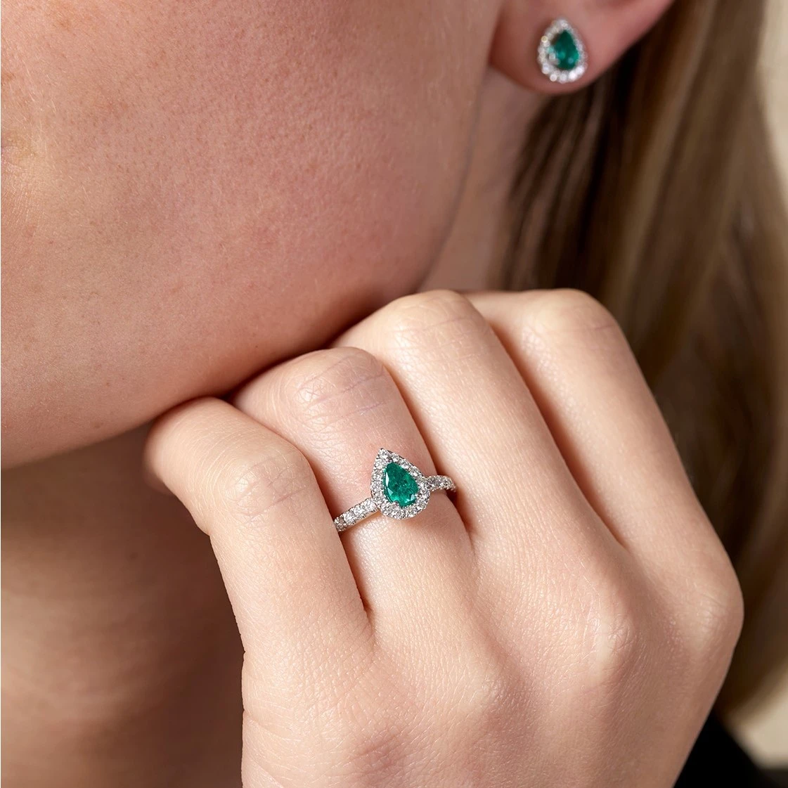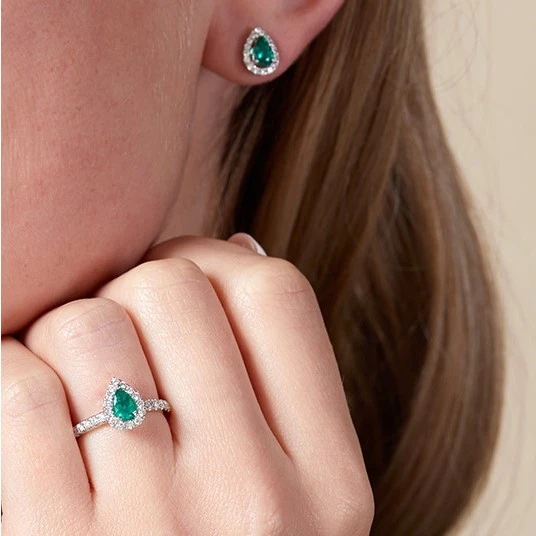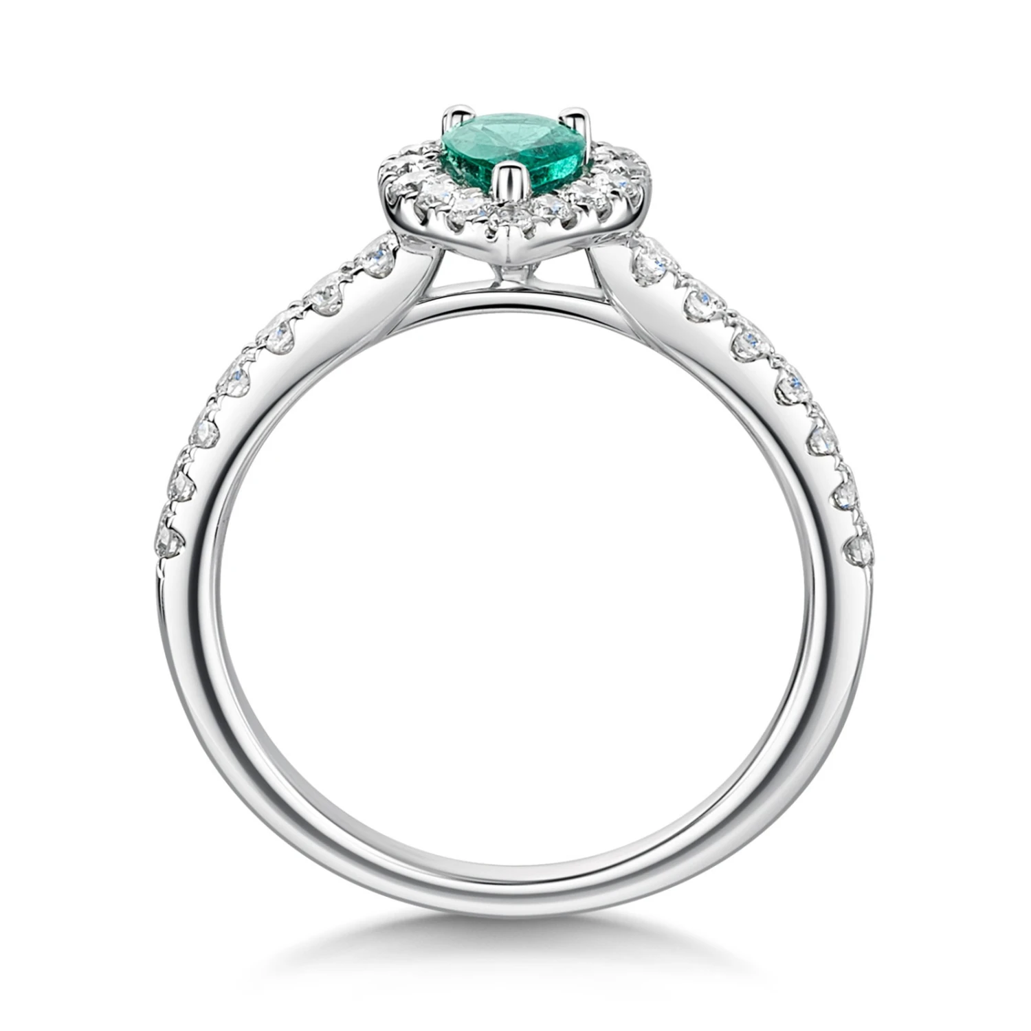 An elegant design, showcasing emeralds and diamonds, discover our 18ct white gold pear cut emerald and diamond halo ring. Set on an 18ct white gold diamond shoulder band, this striking ladies ring features a pear cut 0.38ct emerald in the centre surrounded by a dazzling halo of round brilliant 0.40ct diamonds. A timeless design to be worn for years to come.