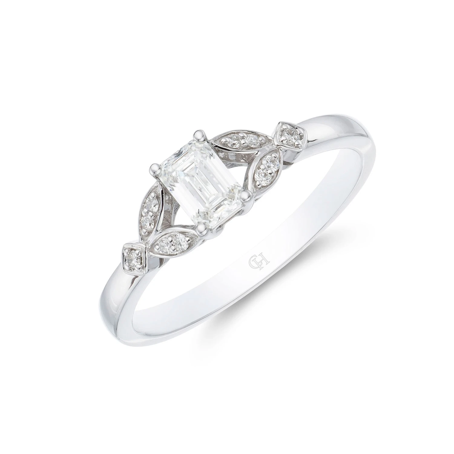 Discover this stunning 18ct white gold cluster ring here today at Chisholm Hunter. The exquisite emerald cut diamond presented at the centre and is complemented by surrounding mixed cut diamonds. The elongated shape gives the illusion of a greater size and will sparkle from all angles on your loved one’s finger. Diamond Information: Cut- Mixed, Colour- H, Clarity-SI, Weight-0.45ct.