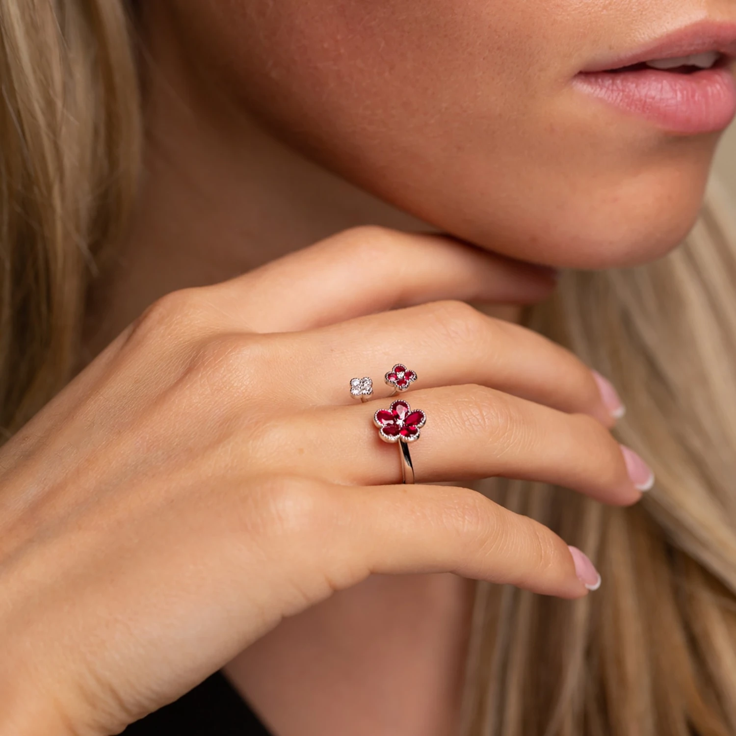 Super feminine yet unique, this ruby and diamond flower ring is unlike any other design. Set on 18ct white gold, the stunning pear cut 0.90ct rubies are positioned in a flower formation and are surrounded by 0.09ct diamond clusters. A pretty, contemporary style with plenty of sparkle. Diamond Information: Cut – Pear & Round Brilliant, Colour- G-H, Clarity- SI, Carat Weight- 0.99ct.