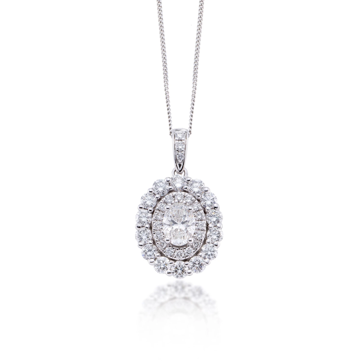 Wonderfully designed; this 18ct white gold diamond necklace, with a total diamond carat weight of 1.40ct, will give your look a touch of sparkling luxe. A 0.50ct oval cut diamond is further enhanced by a sparkling halo of round brilliant diamonds, making this a piece that will perfectly complement and enhance any look, both day or night. Sure to become a welcomed additon to any jewellery box, whether for yourself or a gift for that someone special.