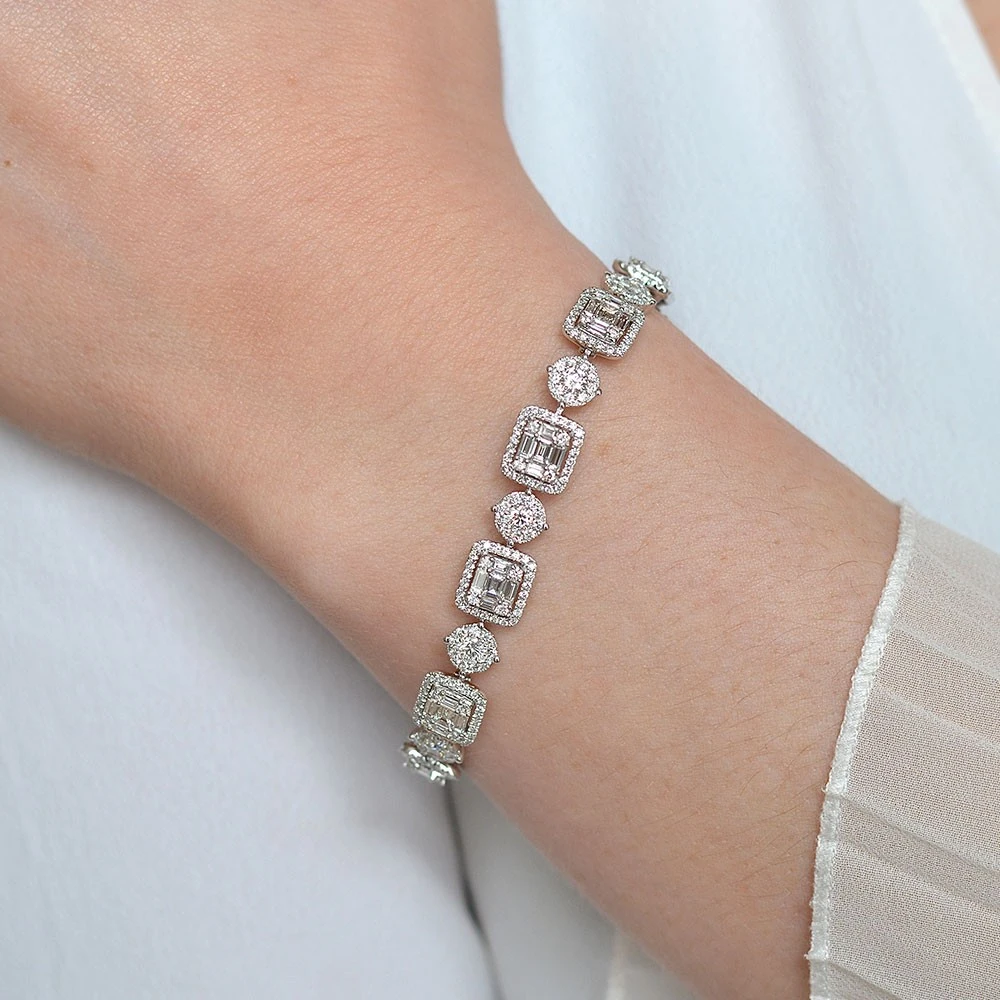 A timeless and feminine design, this 18ct white gold diamond bracelet will add a touch of sparkling luxe to any occasion. Made up of dazzling baguette and rount brilliant cut diamonds, with a total diamond carat weight of 6.00ct, halos of smallers diamond surround clusters of diamonds in this dazzling jewellery piece. A wondering gift for a loves one and a welcomed additon to any jewellery box that will be worn time and time again.
