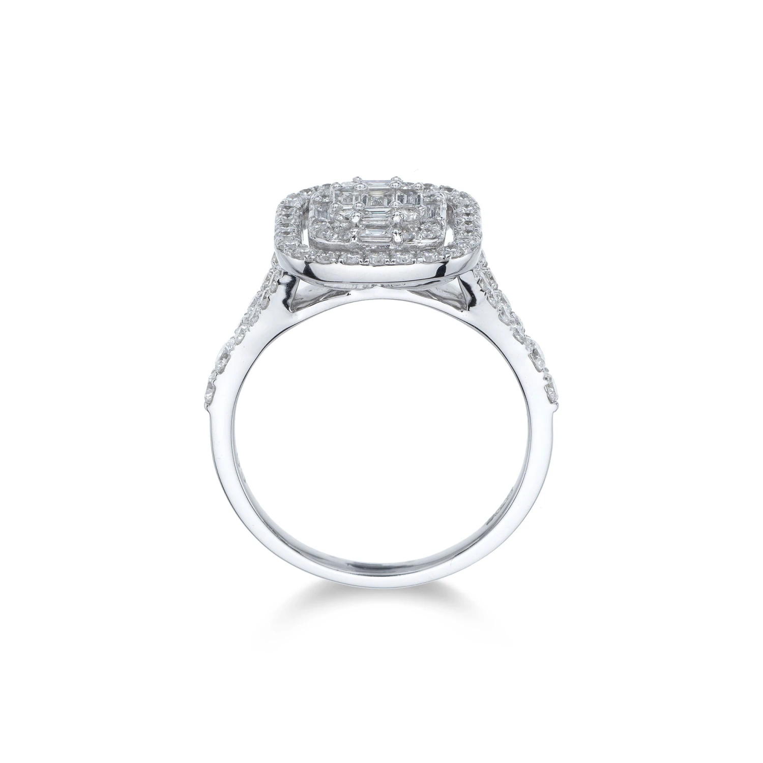 The most beautiful ring to celebrate an anniversary, mark an important mile stone, or just to say “I love you”, this 1.00 total diamond carat weight 18ct white gold cluster ring is the perfect choice. Present to your loved one this unique design, inspired by vintage and classic styles, a mix of round brilliant and baguette cut diamonds are at the centre of a glittering halo of round brilliant cut diamonds, that is further enhanced by diamond set split shoulders; a design that is gauranteed to sweep your loved one off their feet. Diamond Information: Cut- Round Brilliant And Baguette Cut, Colour – G-H, Clarity – SI1-SI2, Carat Weight – 1.00ct.