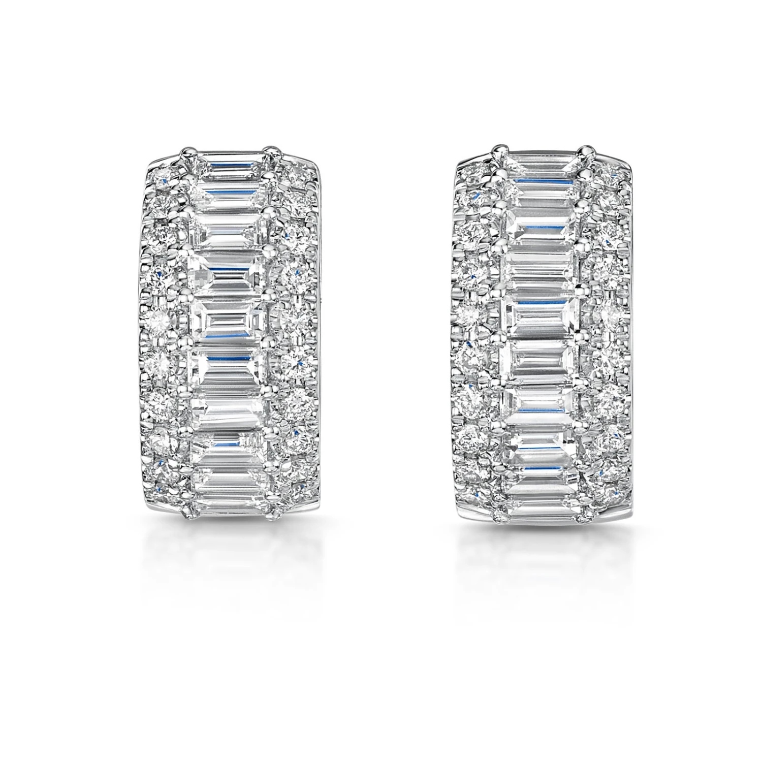 A full hoop with a stunning 1.25ct total of diamonds, these statement earrings are a beautiful way to treat yourself or someone special. Secured on a 18ct white gold setting, this pair give sparkle and texture from every angle. With a cluster of baguette and round brilliant diamonds, these earrings balance glamour and beauty.