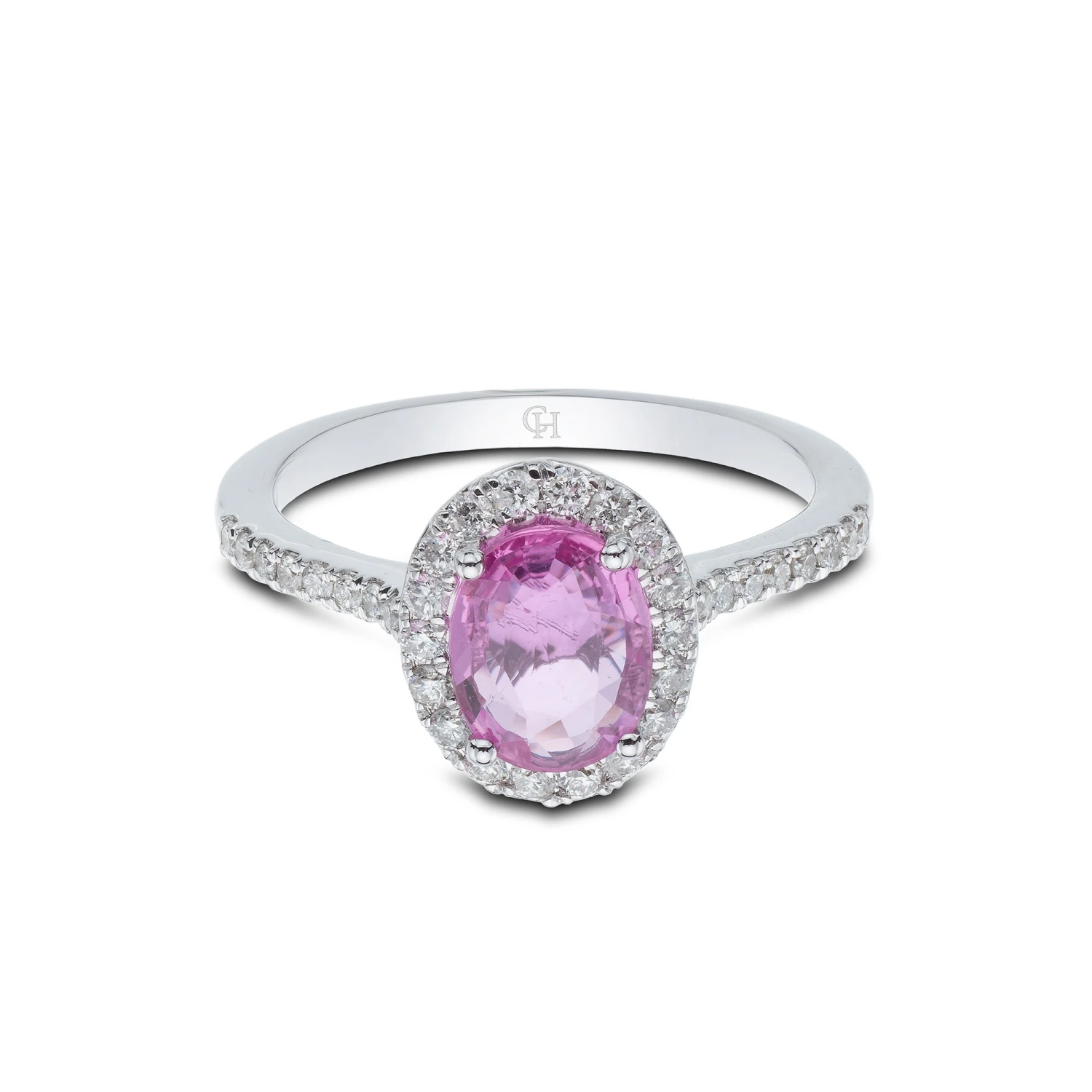 Chisholm Hunter 18ct White Gold Oval Cut Pink Sapphire 2.17ct Diamond Halo Ring