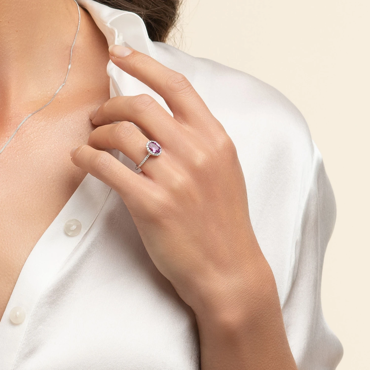 Be the first to review “Chisholm Hunter 18ct White Gold Oval Cut Pink Sapphire 2.17ct Diamond Halo Ring” Cancel reply