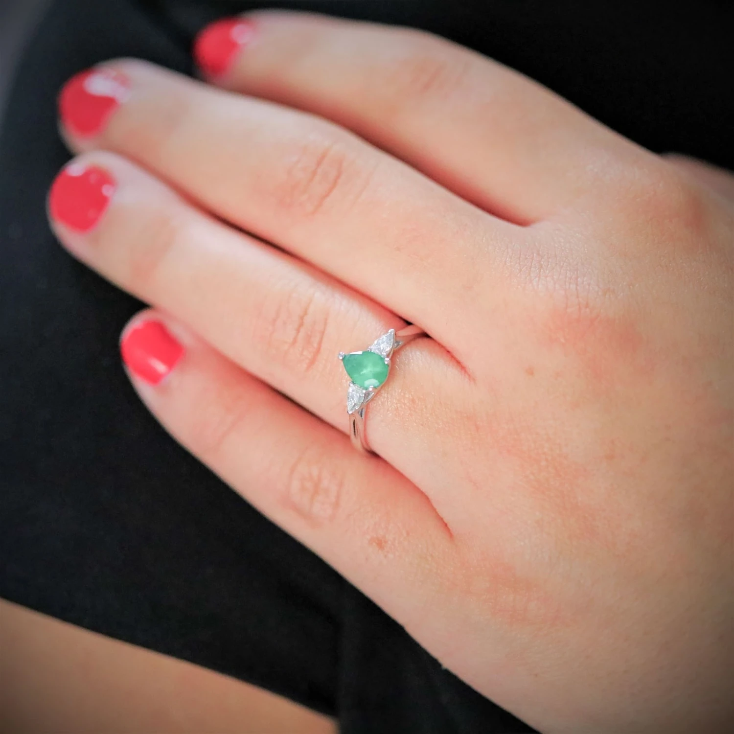 A elegant design, this 18ct white gold emerald and diamond 3 stone ring is the most beautiful gift to celebrate an anniversary, mark an important mile stone, or just to simple say “I love you”. Two pear shaped diamonds, a total diamond carat weight of 0.17, sit on either side of a 0.70ct pear shaped emerald, in a design that is sure to be treasured forever by your loved one.