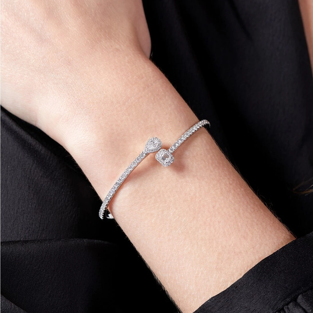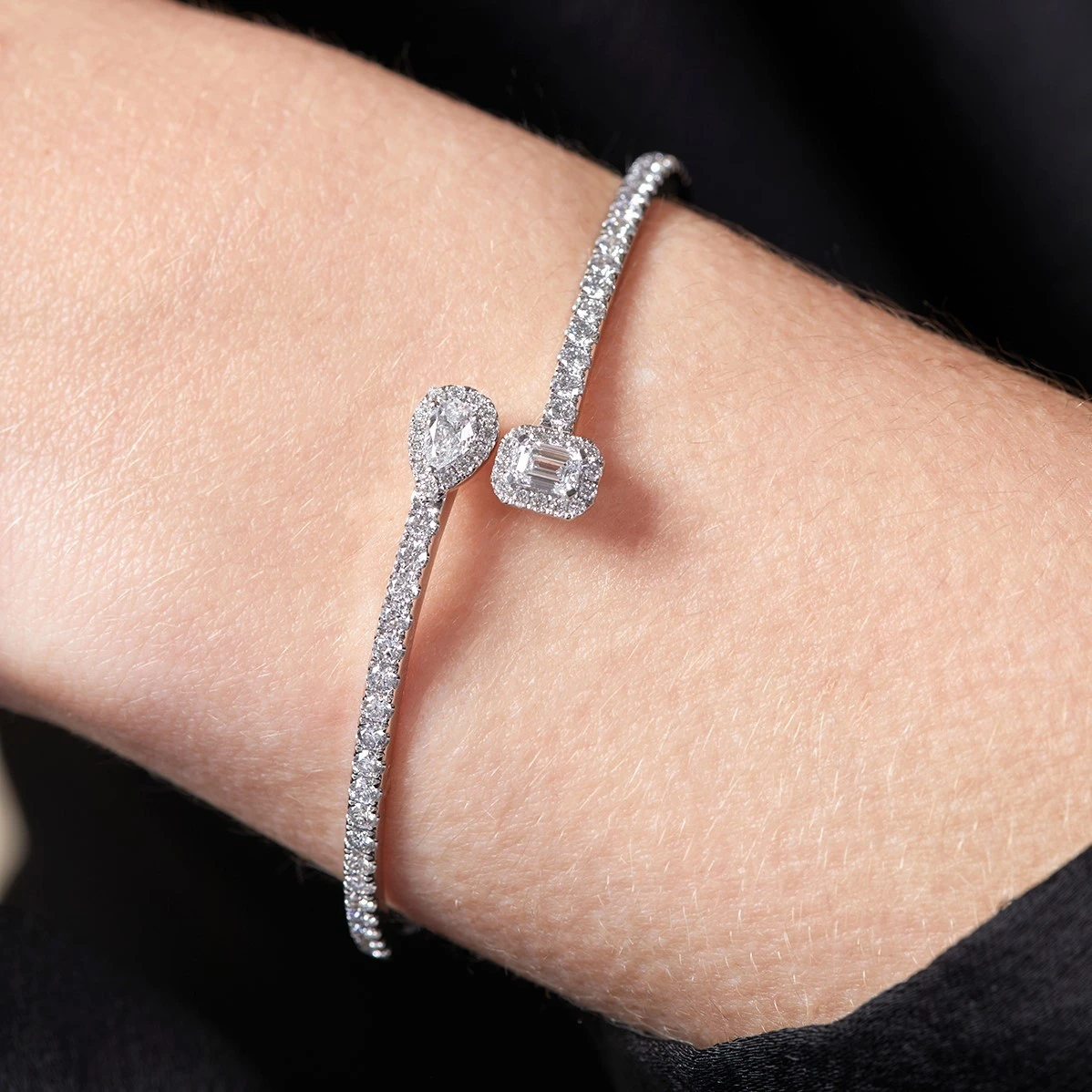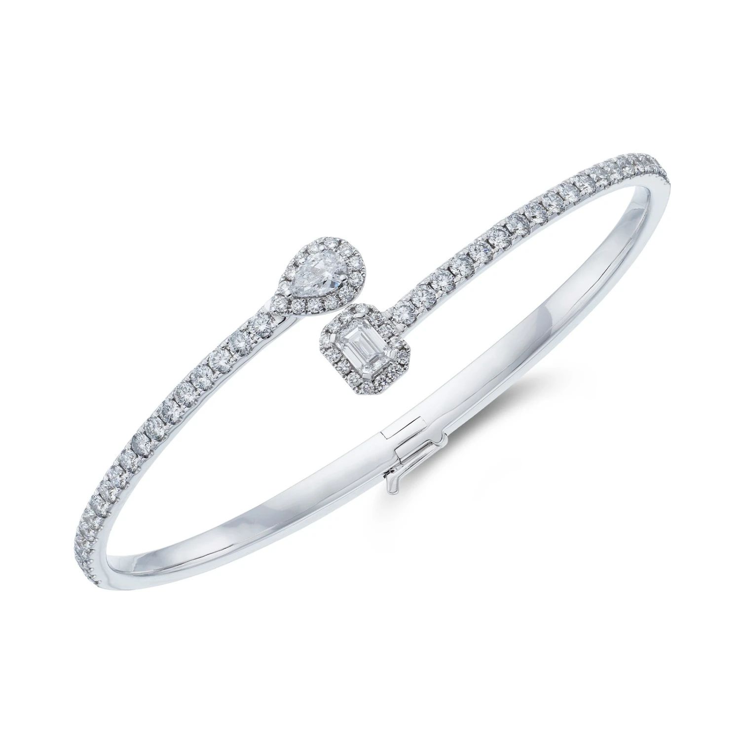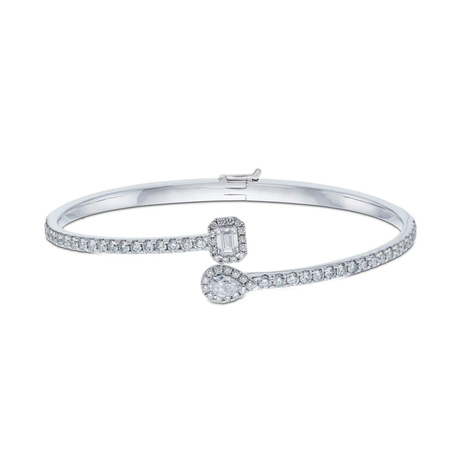 Reflecting light from every angle, our 18ct white gold bangle is expertly crafted for a flawless finish. Encrusted with stunning emerald and pear cut diamonds that crossover in the centre, this delicate diamond bangle is accented by brilliant cut diamonds for a show-stopping finish. With a total carat weight of 0.57, pair with the matching necklace and ring for a truly stunning set that is sure to impress.