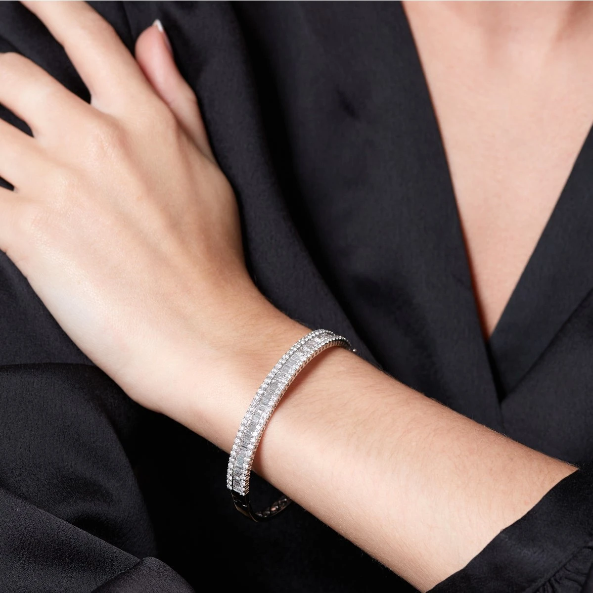 Be the first to review “Chisholm Hunter 18ct White Gold Round Brilliant And Baguette Cut 5.00ct Diamond Bangle” Cancel reply