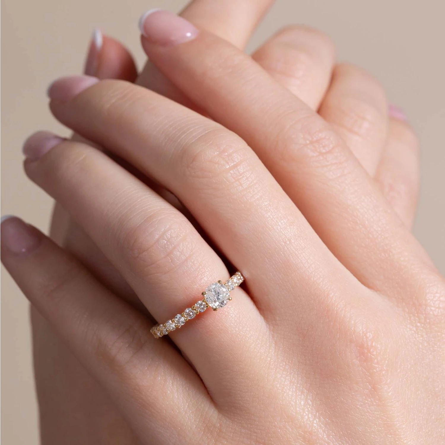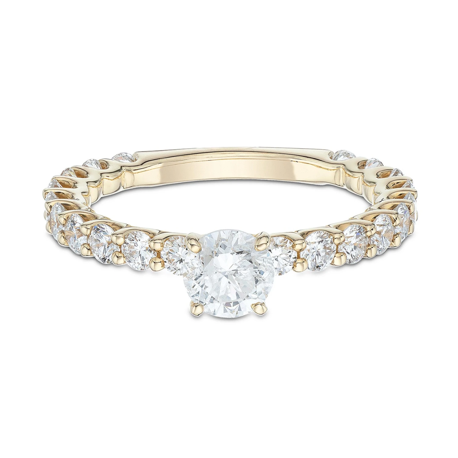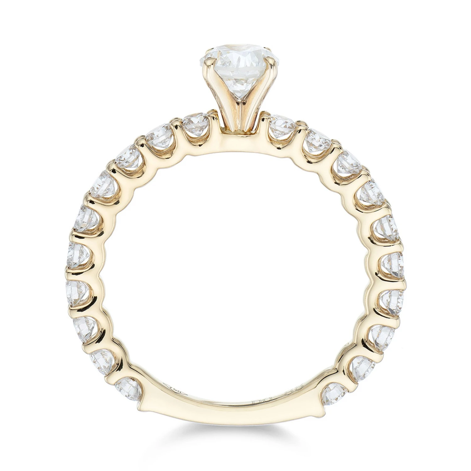 With beautifully clean lines this classic 0.50ct round brilliant diamond solitaire is exquisitely elevated with alluring scalloped style diamond shoulders for maximum light to illuminate your diamonds from every angle. Expertly designed in 18ct yellow gold, the 3/4 diamond set shoulders wrap around your finger for a dazzling display and maximum comfort with a total diamond weight of 1.40ct.