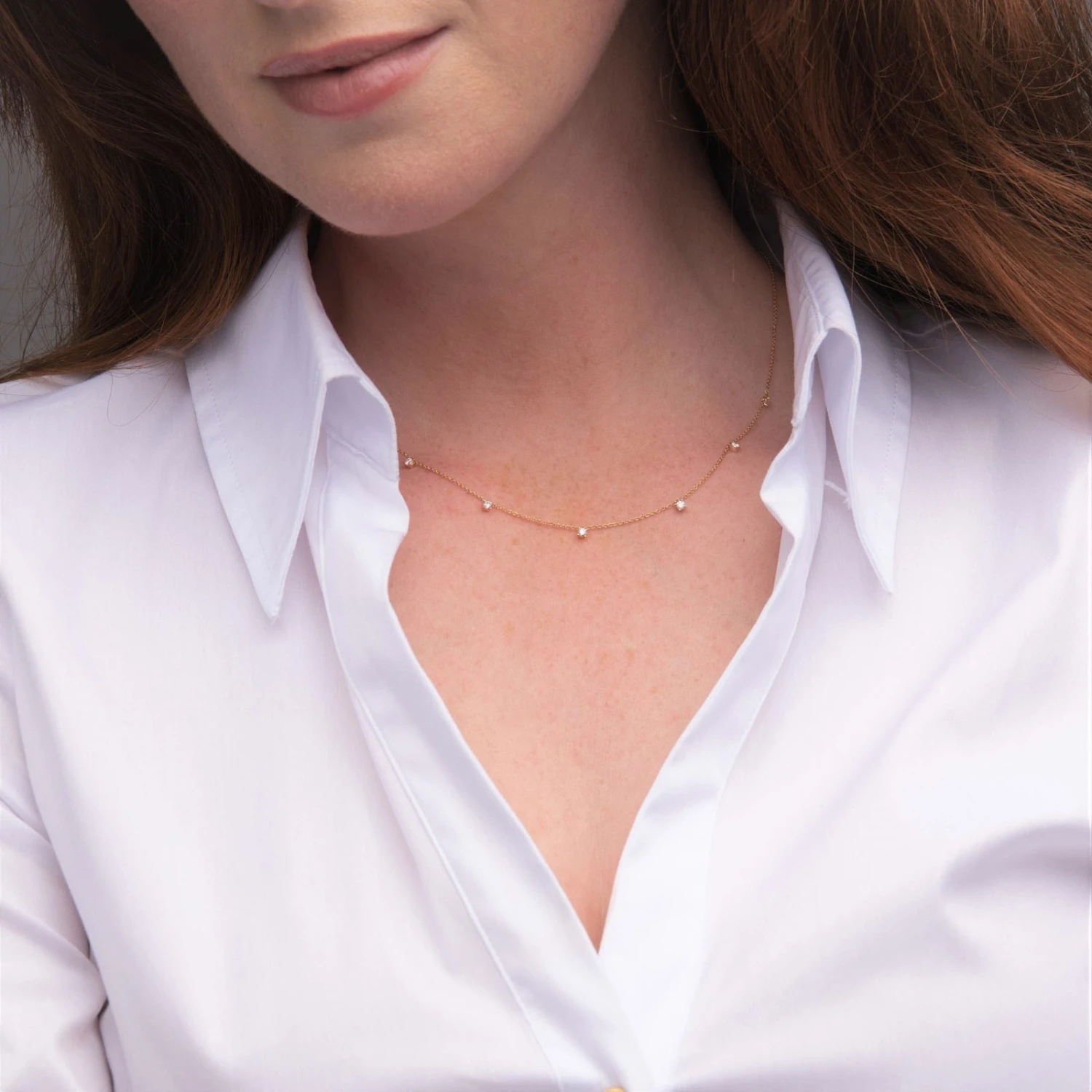 Let this 18ct Yellow Gold Brilliant Cut 0.30ct Diamond Necklace subtly sparkle as it sits on your collarbones for the ultimate sophisticated look. The elegant 18ct yellow gold chain holds seven dangling round brilliant cut diamonds held in four-claw settings.