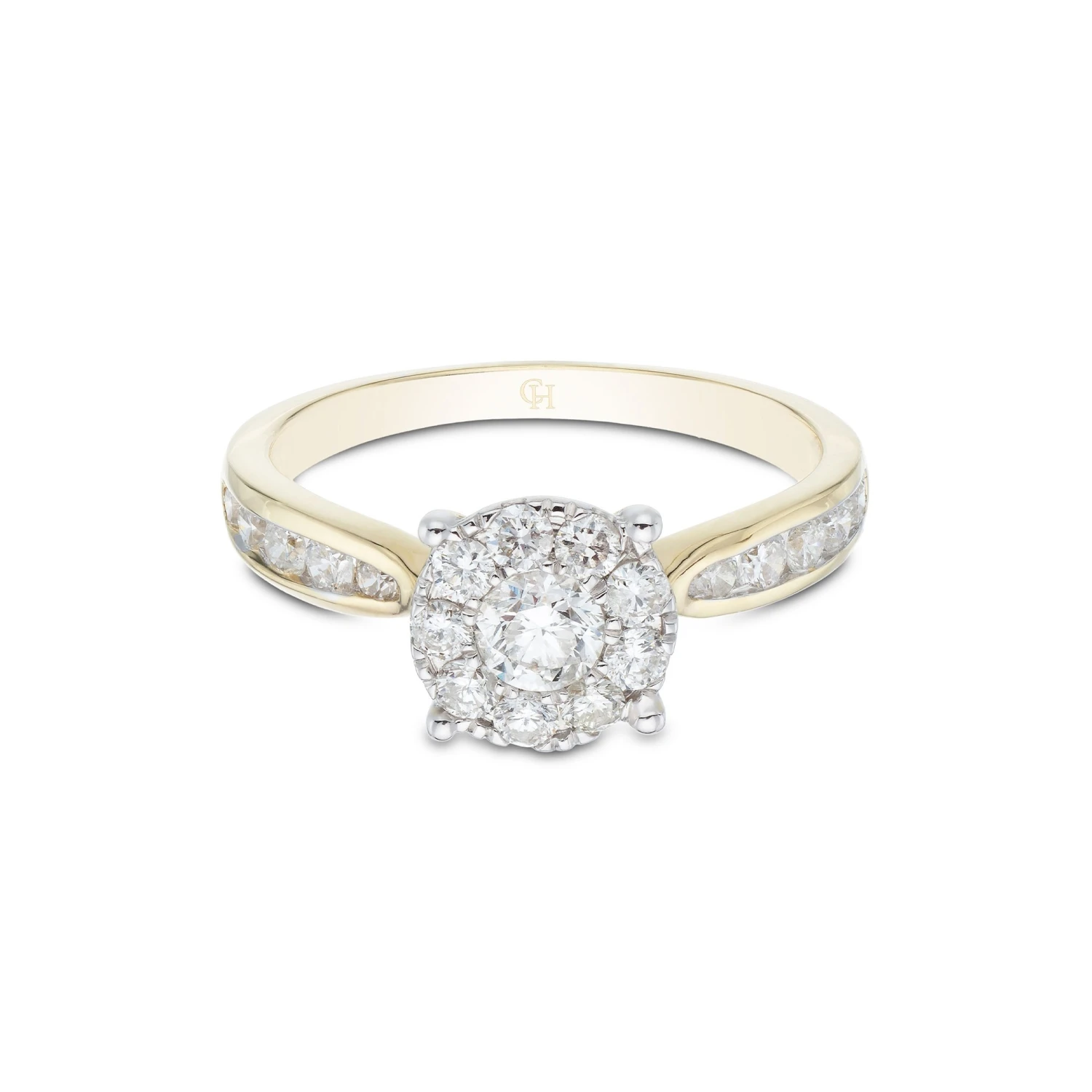 Propose to your loved one with this stunning 18ct Yellow Gold Brilliant Cut 0.75ct Diamond Cluster Ring from Chisholm Hunter. Round brilliant diamonds make up the cluster that sits in the centre of the 18ct yellow gold band, supported by dazzling diamond shoulders. This eye-catching ring has the following diamond information: Cut – Round Brilliant, Colour – G-H, Clarity – SI1, Carat – 0.75ct.
