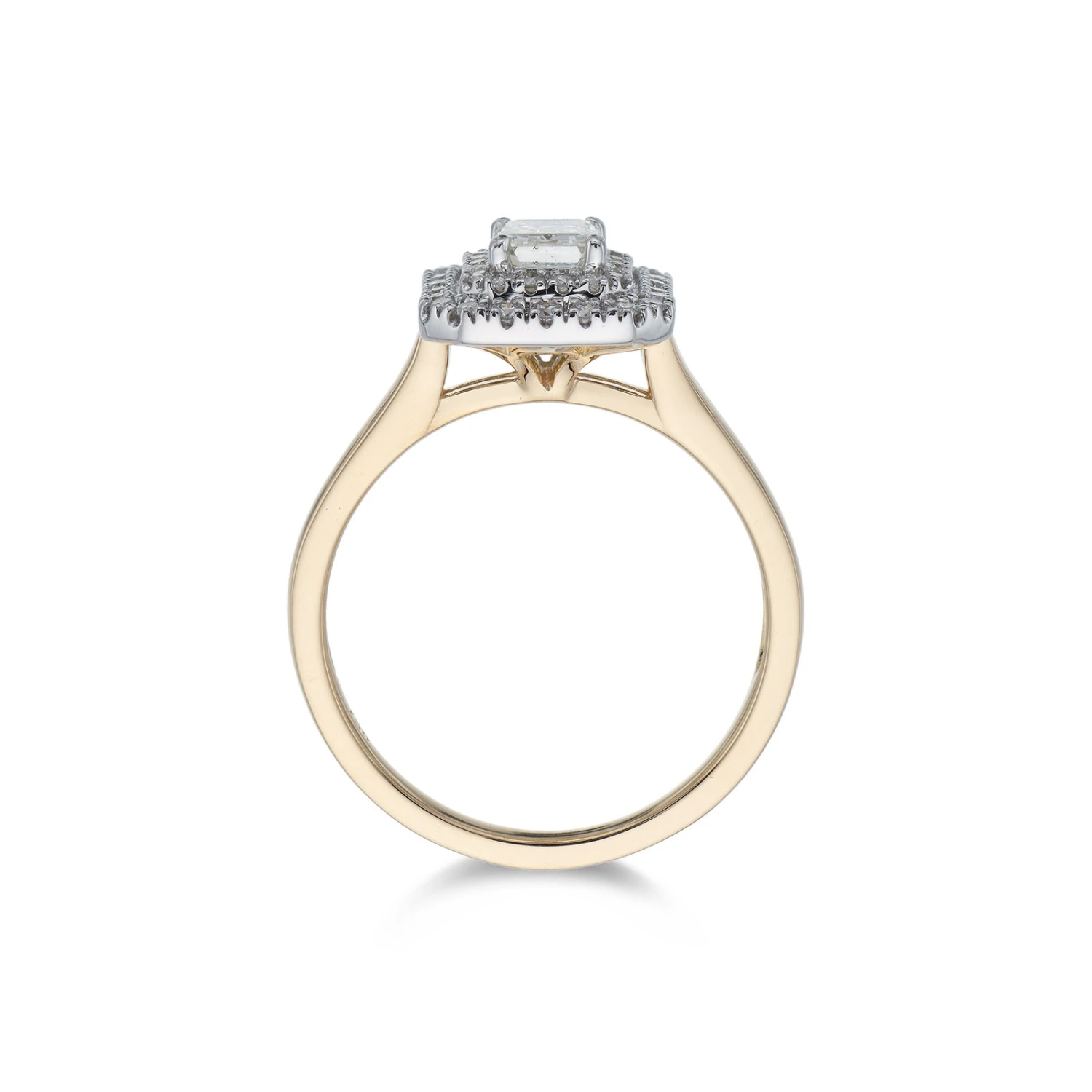 Propose to your loved one with this beautiful 0.75ct total weight double halo ring. This stunning ring features a 0.50ct centre emerald cut diamond, which is complimented by surrounding round brilliant diamonds. Set in 18ct yellow gold, this eye catching ring will be sure to steal your loved one’s heart. Diamond Information: Cut- Emerald, Colour- G-H, Clarity- SI, Carat weight- 0.75ct.