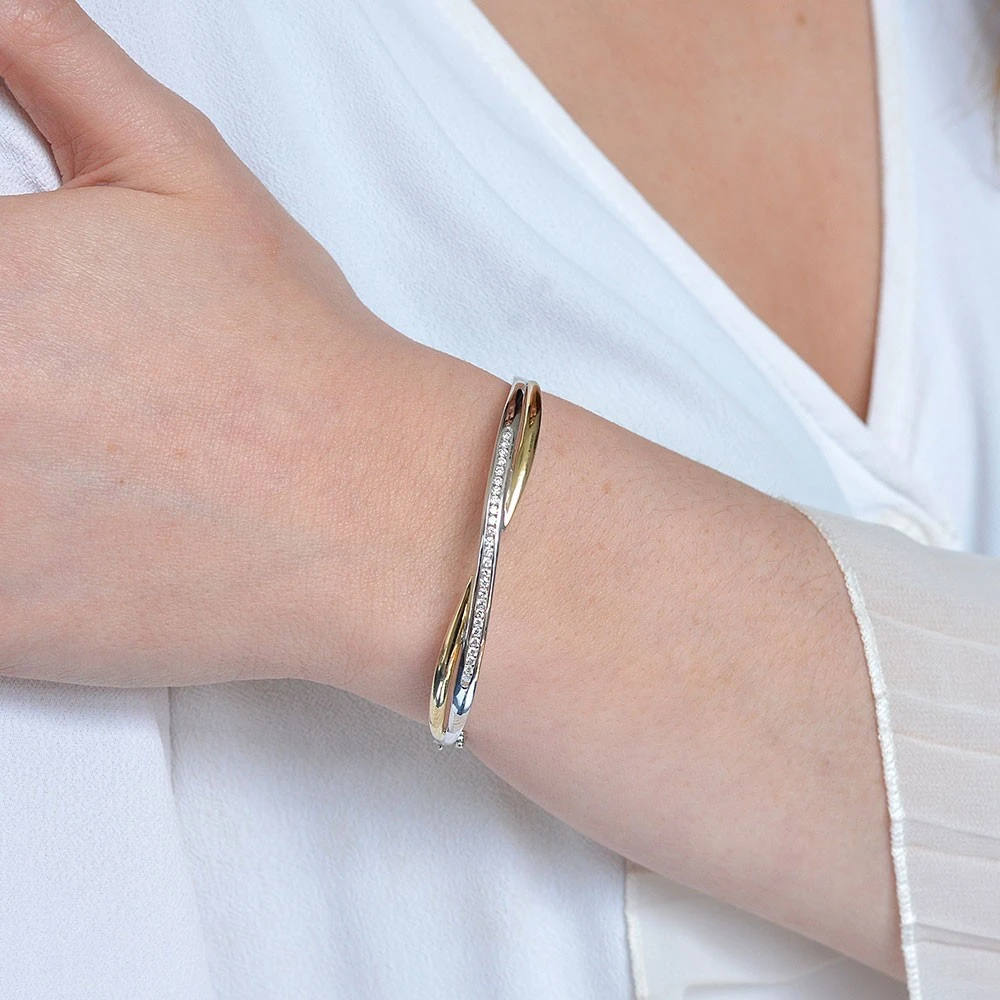 Add a touch of dazzling luxury with this 9ct 2 colour gold diamond bangle. A beautifuly elegant design, a row of channel set round brilliant diamonds are set into a white gold band which entwines with a fine yellow gold band in a cross over style. A timeless jewellery piece, that can be worn for any occasion would be a welcome addition to any jewellery collection and a perfect gift for that someone special.