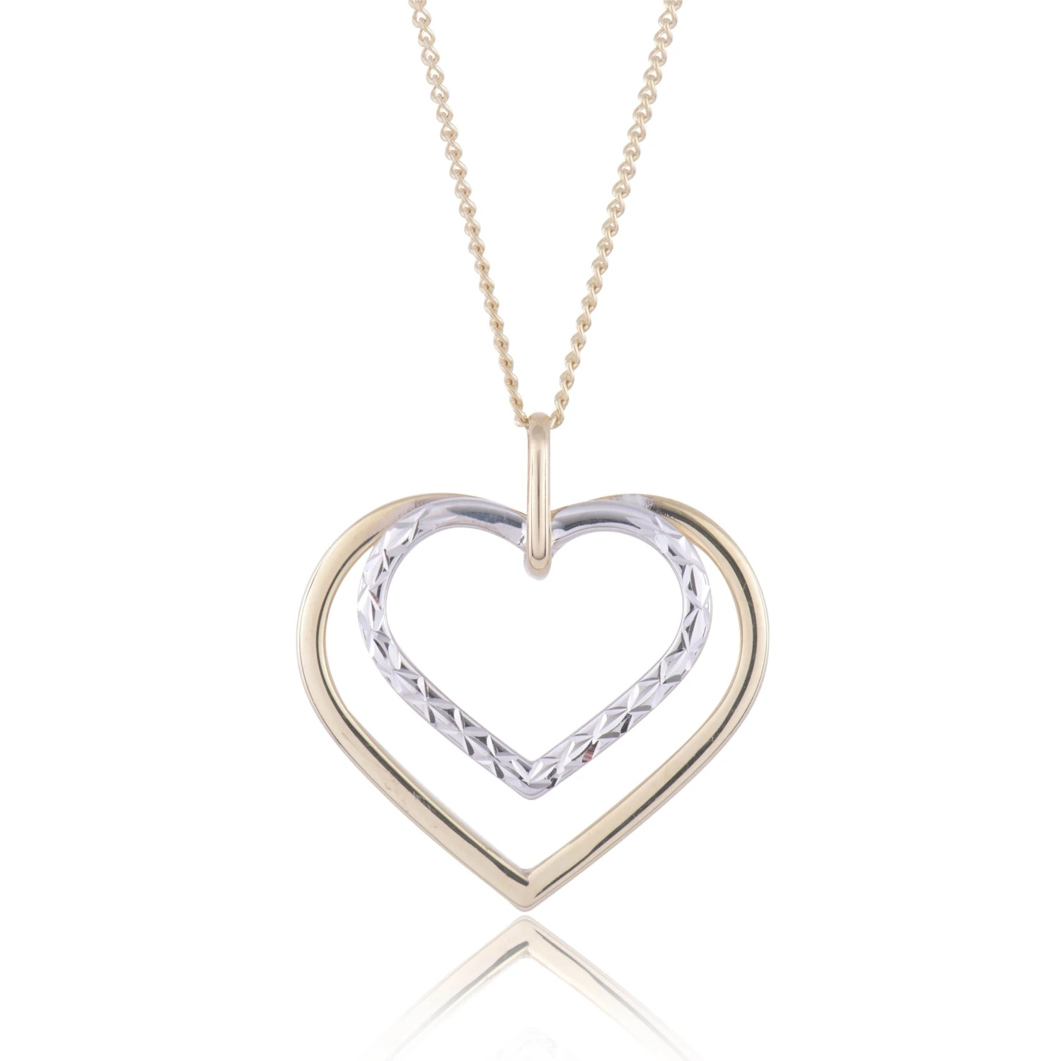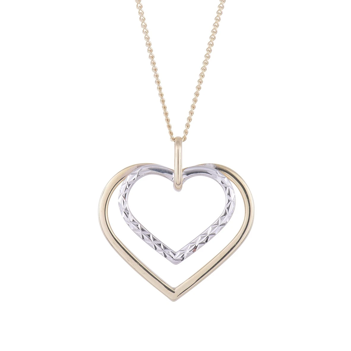 Fall in love with this 9ct yellow gold chain with 2 colour pendant. An eyecatching combination, this pendant features a large polished yellow gold heart with a smaller diamond cut white gold heart at the centre. Simple and exquisite, this will be the most special piece in your jewellery box.