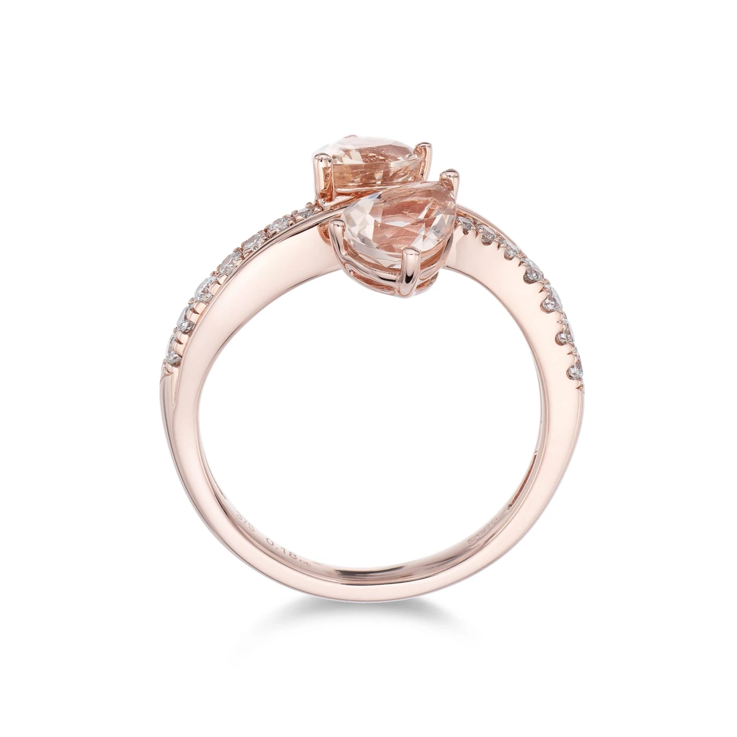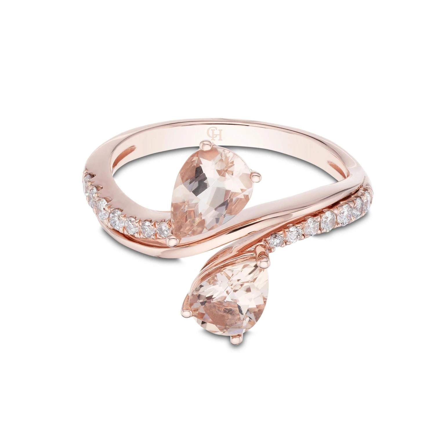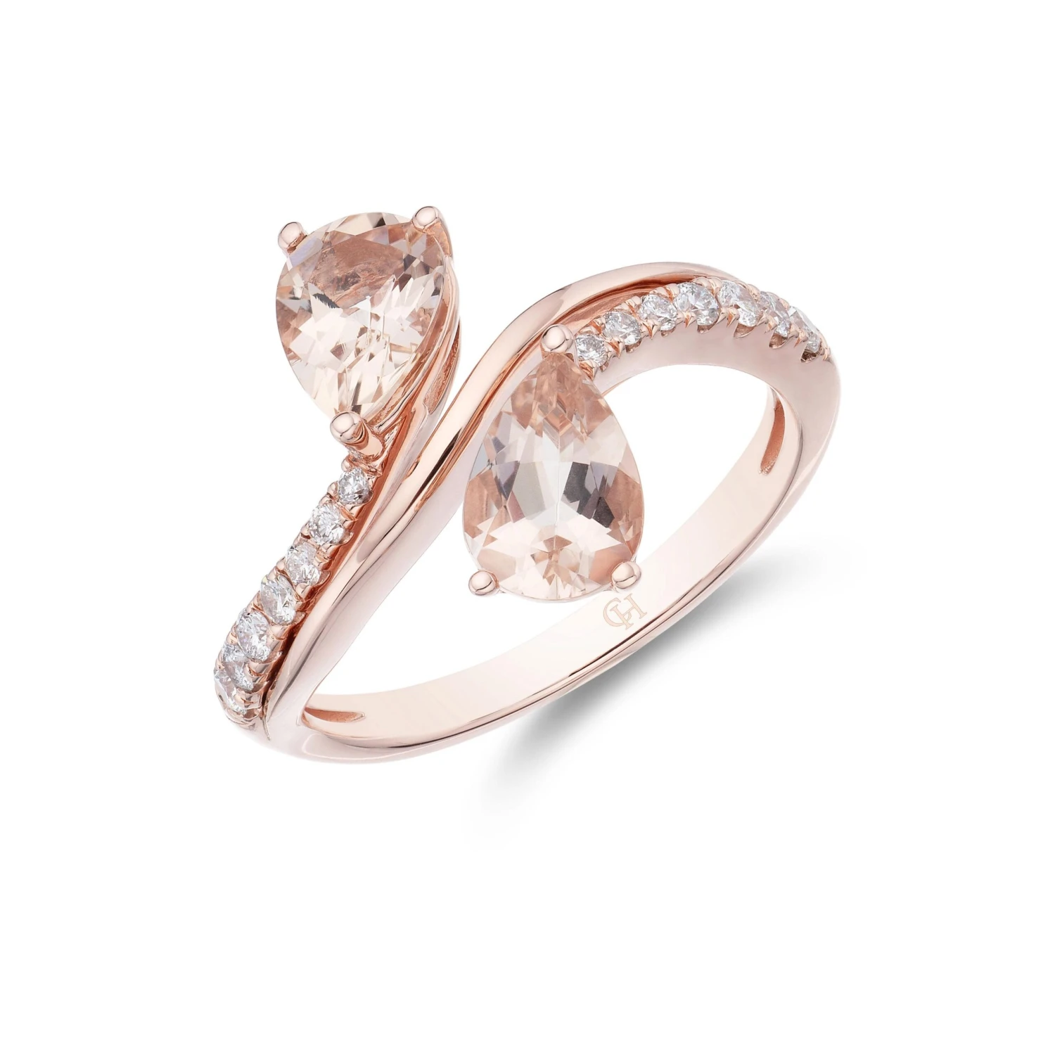 Certain to steal your loved ones heart with it’s two stone design, our 9ct rose gold cluster ring features two magnificent pear cut morganite weighing 1.50ct, accented by round brilliant diamonds on the shoulders. A stunning ring with feminine edge.