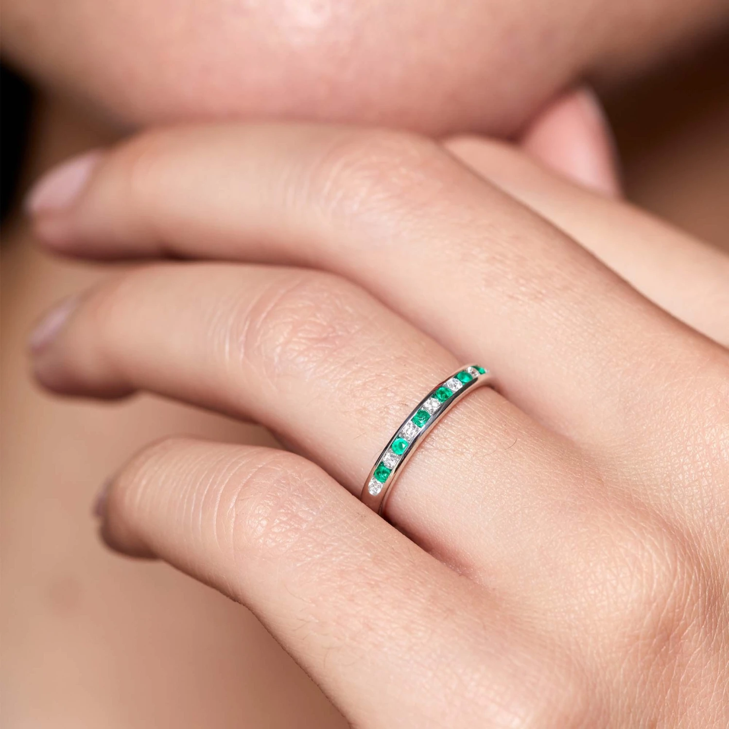 Crafted in stunning 9ct white gold, this ring exudes sophistication with every glance. The precious metal provides a radiant backdrop for the mesmerising diamonds and emeralds that adorn it. The combination of these two precious gemstones adds a touch of glamour and allure to this already stunning piece.