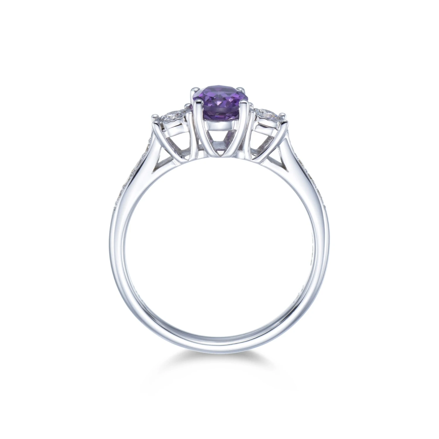 A classic style with a modern twist, this 9ct white gold 0.22ct diamond and 0.75ct amethyst ring is the most beautiful way to celebrate an anniversary, mark an important mile stone, or just to say “I love you”. Presented in a clean, elegant and classic 4 claw setting, a 0.75ct amethyst stone sits between two 0.11ct diamonds on a sparkling diamond shoulder.