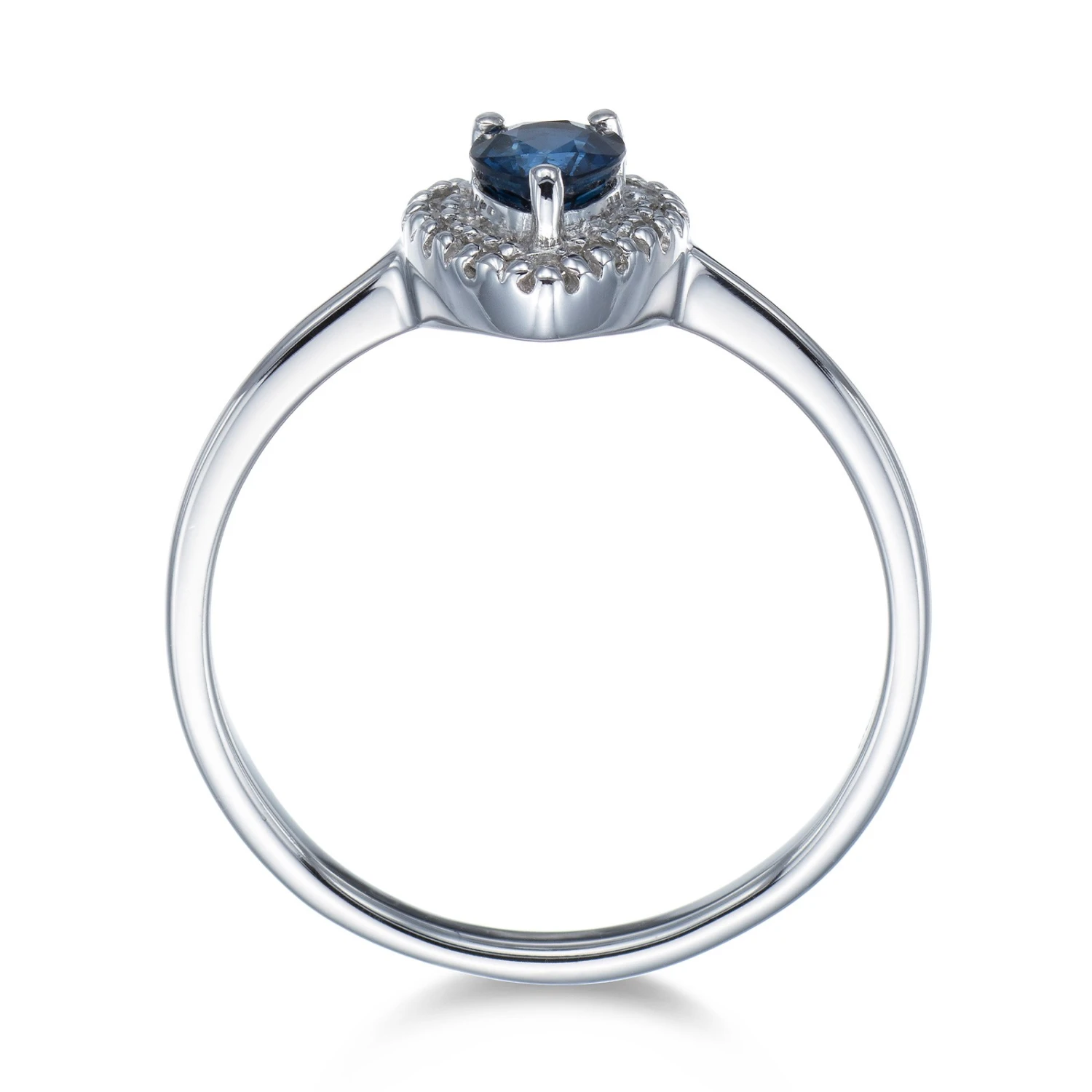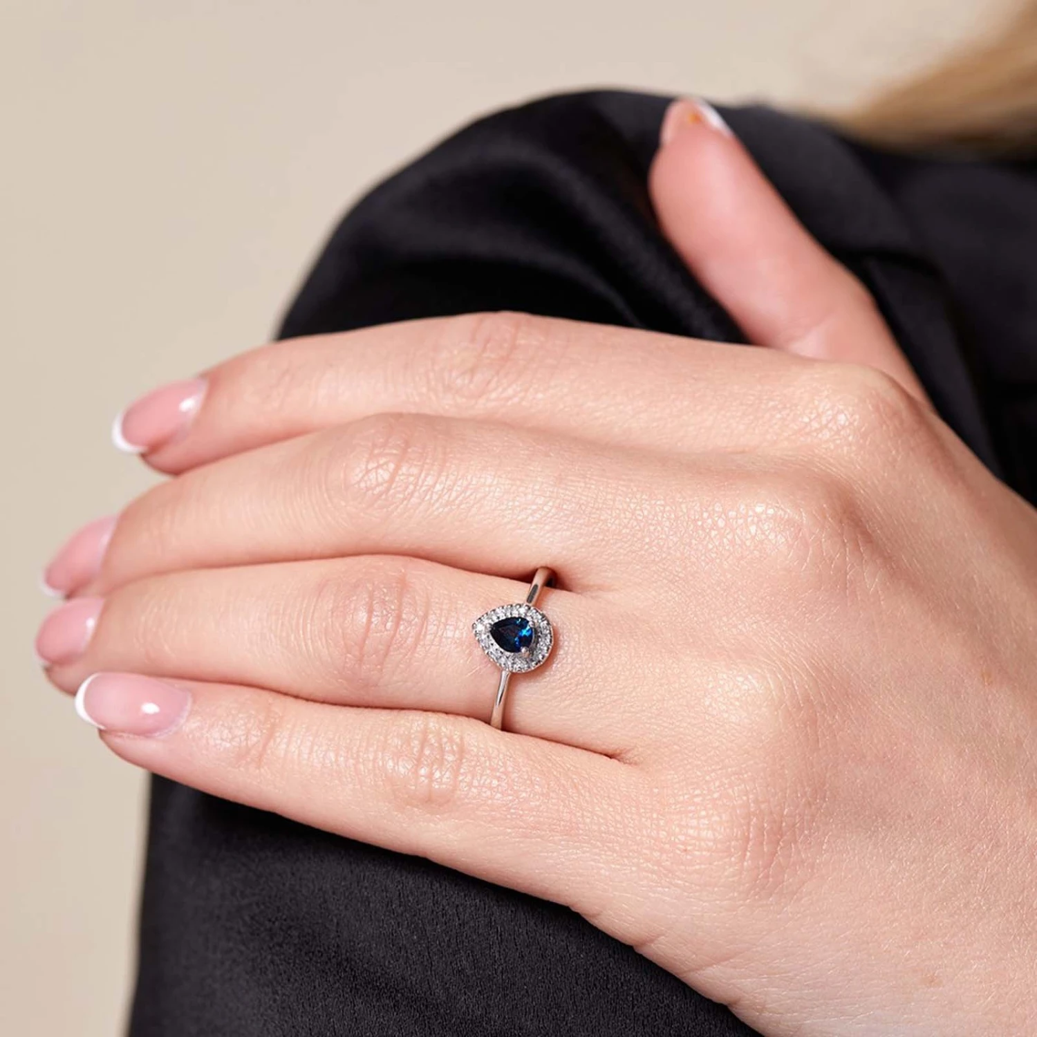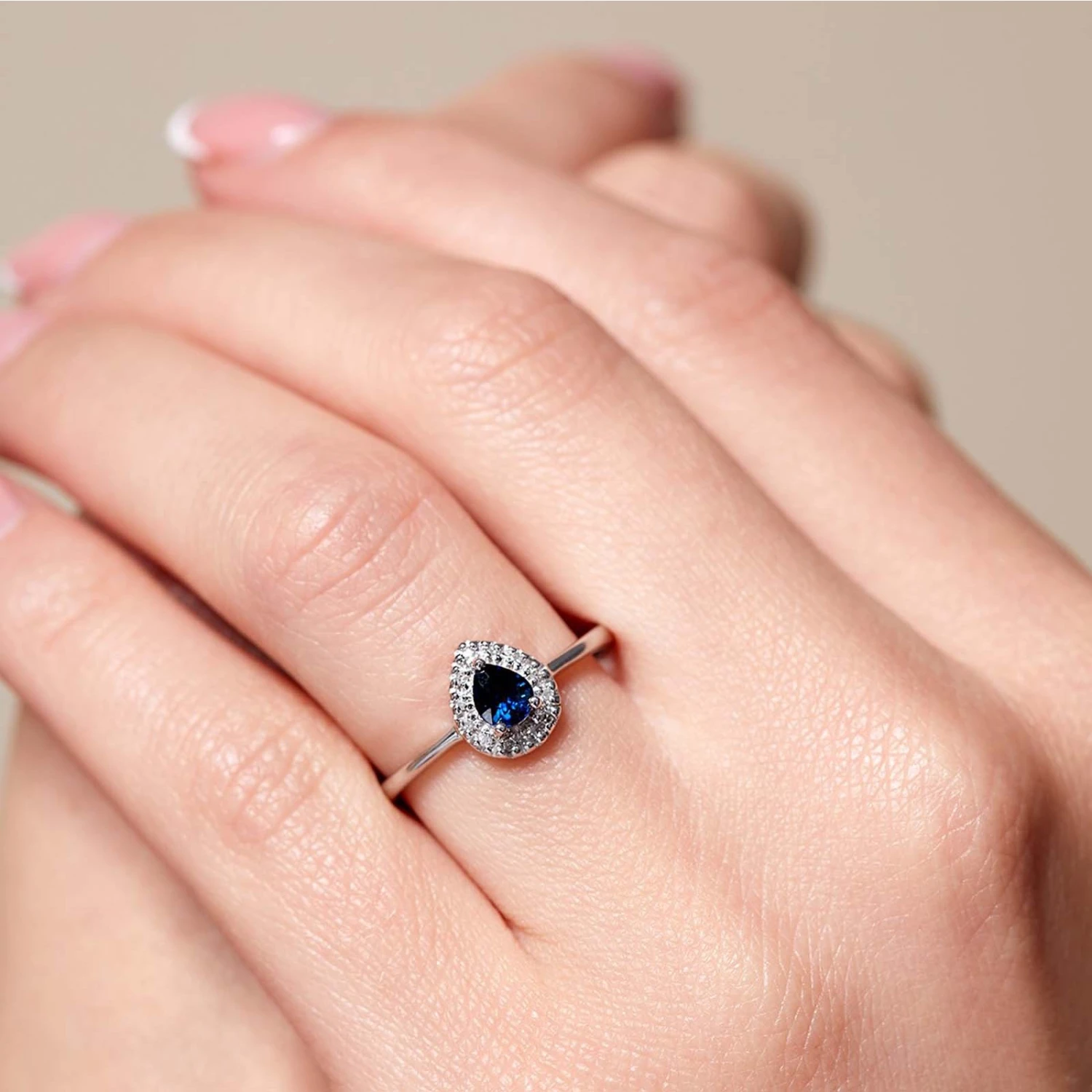 Truly romantic, this 9ct white gold sapphire and diamond engagement ring is a true representation of your love and commitment to your loved one. A breath taking 0.40ct pear shaped sapphire is held in a 3 claw setting and surrounded by a sparkling cluster of round brilliant diamonds, with a total diamond carat weight of 0.38ct. The delicate 9ct white gold band adds to the feminine design, making this one your loved one will treasure forever.