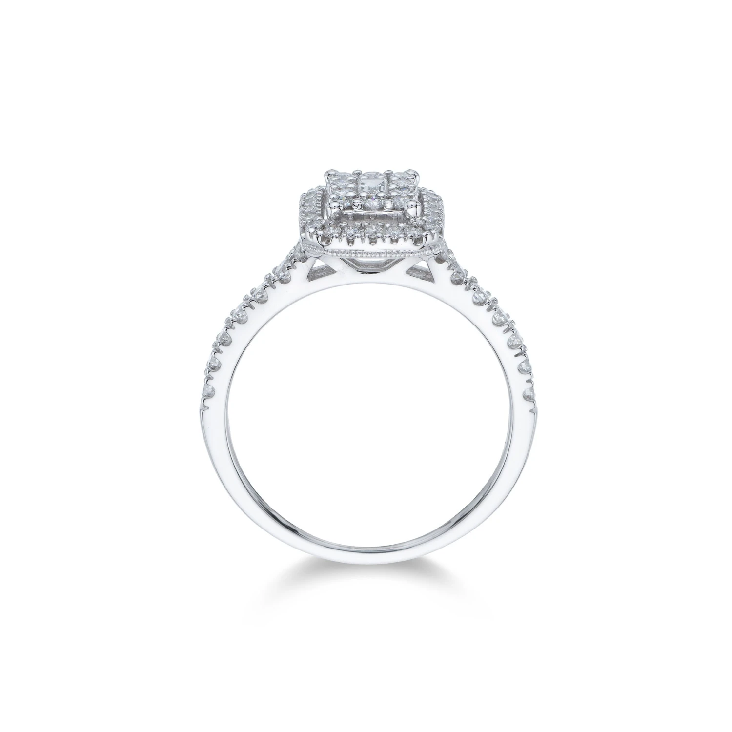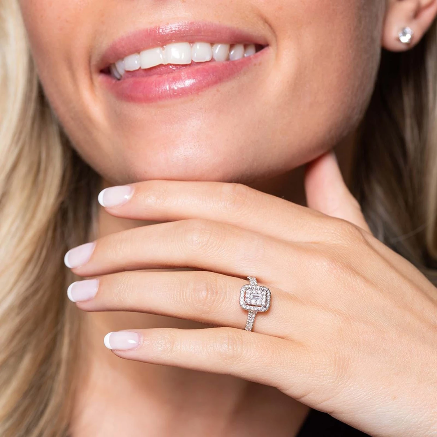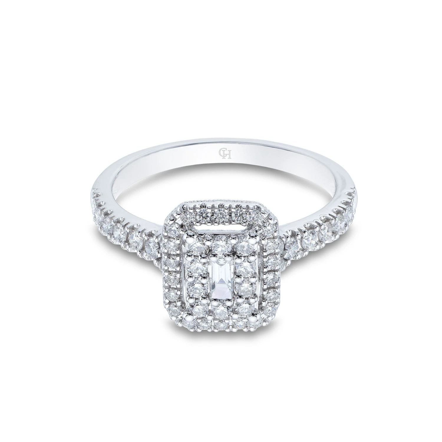 Begin the next chapter in you and your loved one’s love story with this 9ct white gold 0.60 total carat weight diamond cluster engagement ring. At the centre sits a dazzling baguette cut diamond, surrounded by rows of round brilliant cut diamonds creating an emerald shape. Dazzling diamond set shoulders complete this sparkling design that is a wonderful token of your everlasting love.