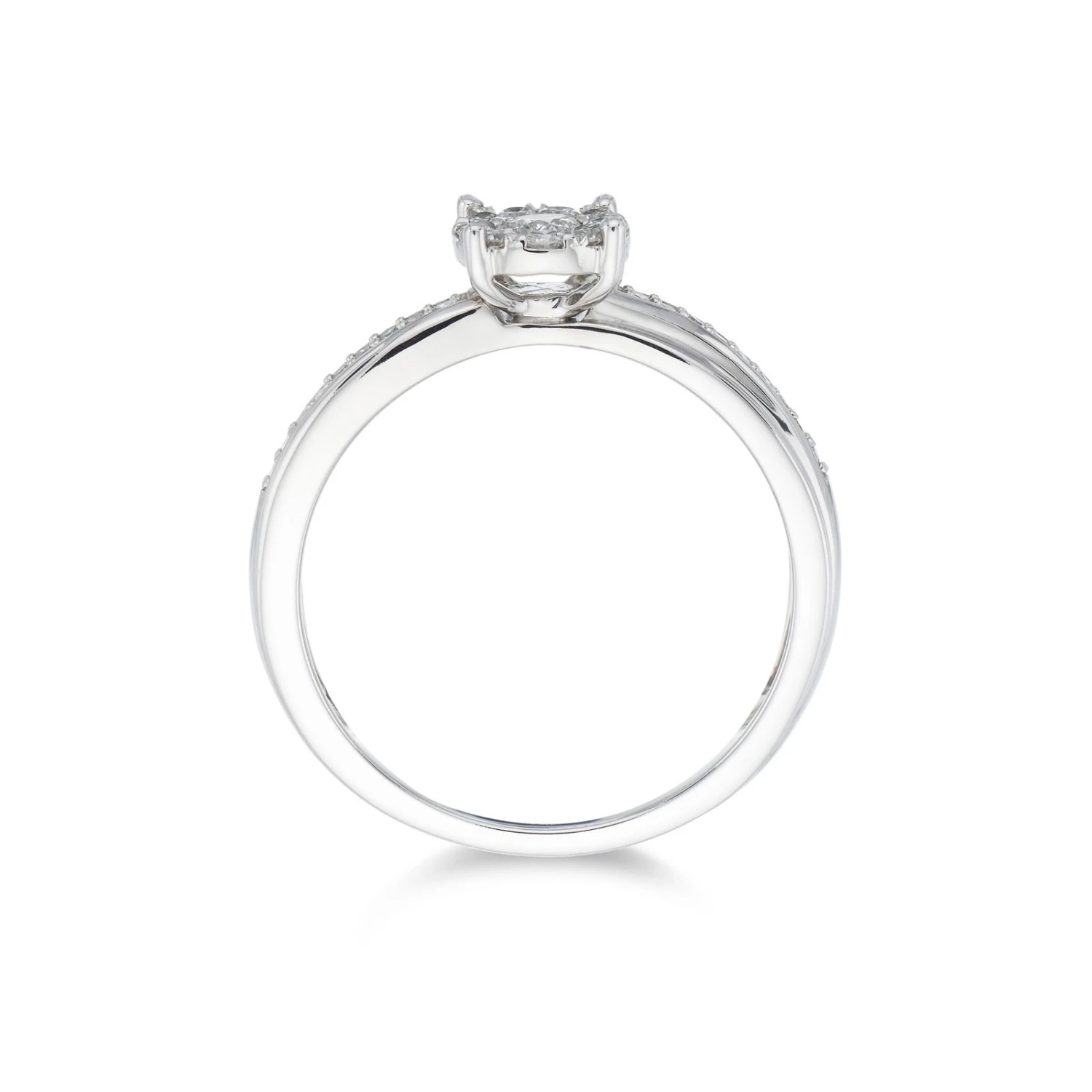 Make the most special moment of your life truly unforgettable with this 9ct white gold cluster diamond twisted engagement ring. A cluster of sparkling round briliant cut diamonds, with a total carat weight of 0.20, sit at the centre of a swirling diamond set and 9ct whte gold band. A beautiful symbol of your eternal love, this is sure to have your loved one falling in love all over again.