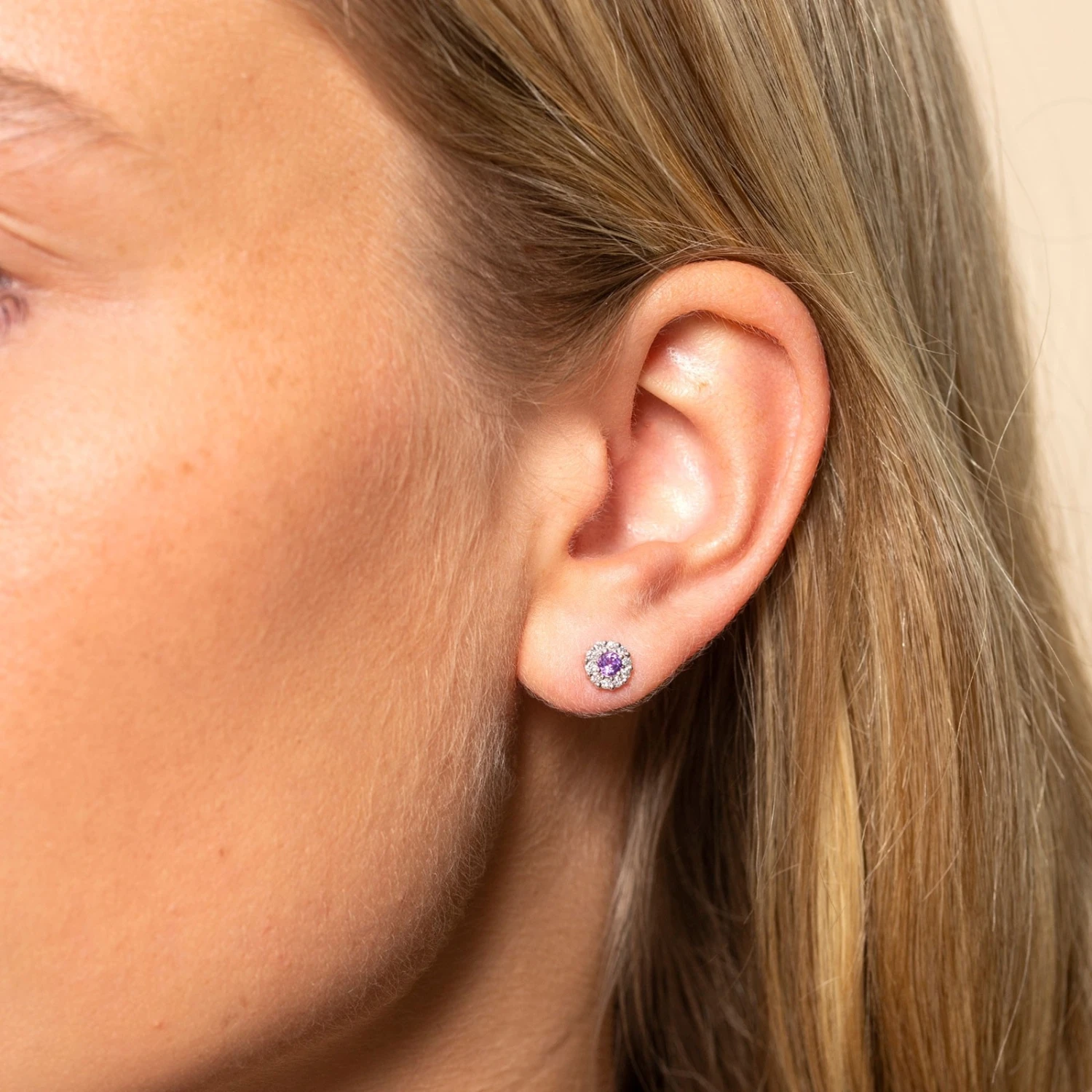 Add these opulent 9ct White Gold Diamond 0.17ct and Amethyst Halo Earrings to your jewellery collection to benefit from the peace and wisdom the gemstone is associated with. Each round stud earring, crafted from smooth 9ct white gold, holds a round amethyst surrounded by a diamond halo. The 3mm earrings are secured with a butterfly fastening.