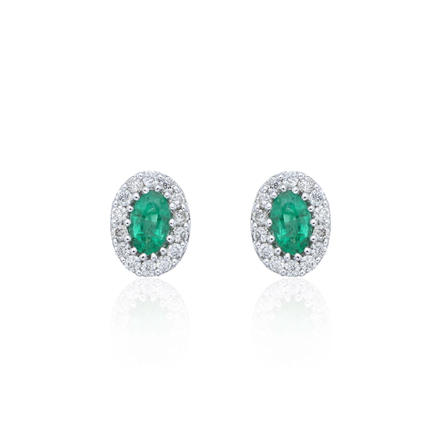 These 9ct White Gold Diamond 0.23ct and Emerald Halo Earrings from Chisholm Hunter exude vintage-inspired elegance. Each stud earring holds a striking oval cut emerald surrounded by a brilliant diamond halo. The oval studs are each 5x3mm and are secured by a butterfly fastening.