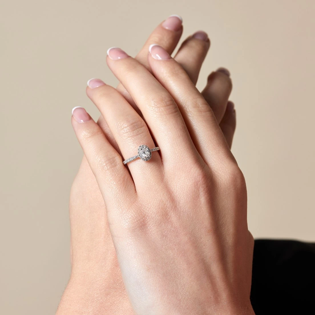 This white gold oval cut 0.50ct diamond halo solitaire ring will be admired by all on the hand of your future fiancé. The sparkle from the stunning oval cut diamond is intensified by the glittering halo and supporting diamond shoulders which elegantly illuminate the white gold band.