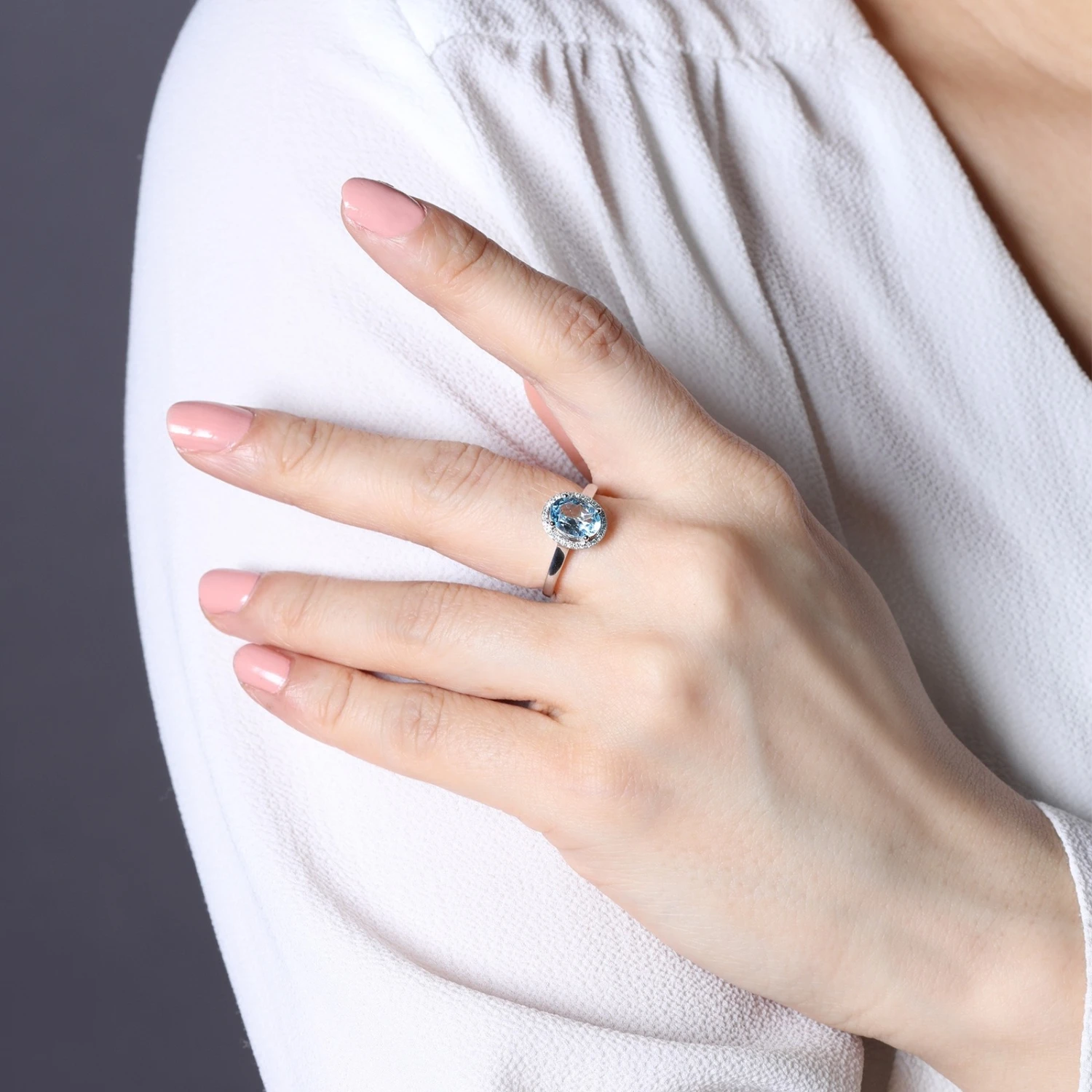 Present your loved one with this 9ct white gold topaz and diamond cluster ring. Traditionally designed this ring features an enchanting sky blue, oval cut topaz weighing 1.60ct framed by a cluster of round brilliant diamonds with a total weight of 0.11ct. A true symbol of your love for your loved one. Diamond Informationt: Cut- Oval Cut & Round Brilliant, Carat- 1.60ct.