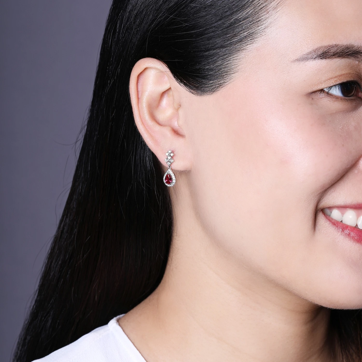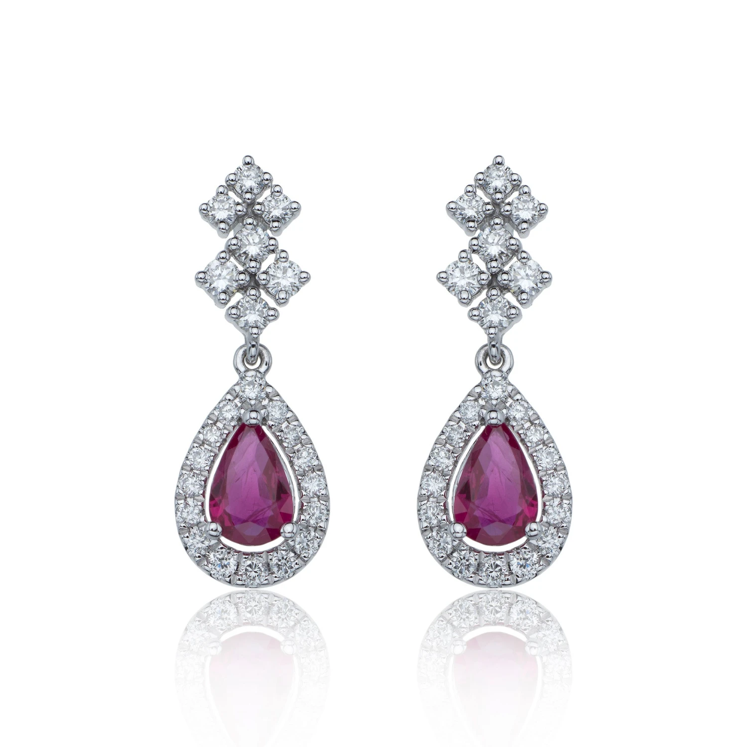 Chisholm Hunter 9ct White Gold Pear Cut Ruby 1.50ct Diamond Halo Drop Earrings