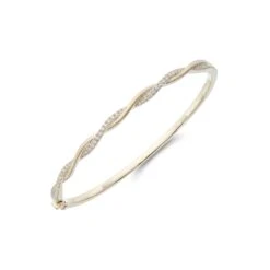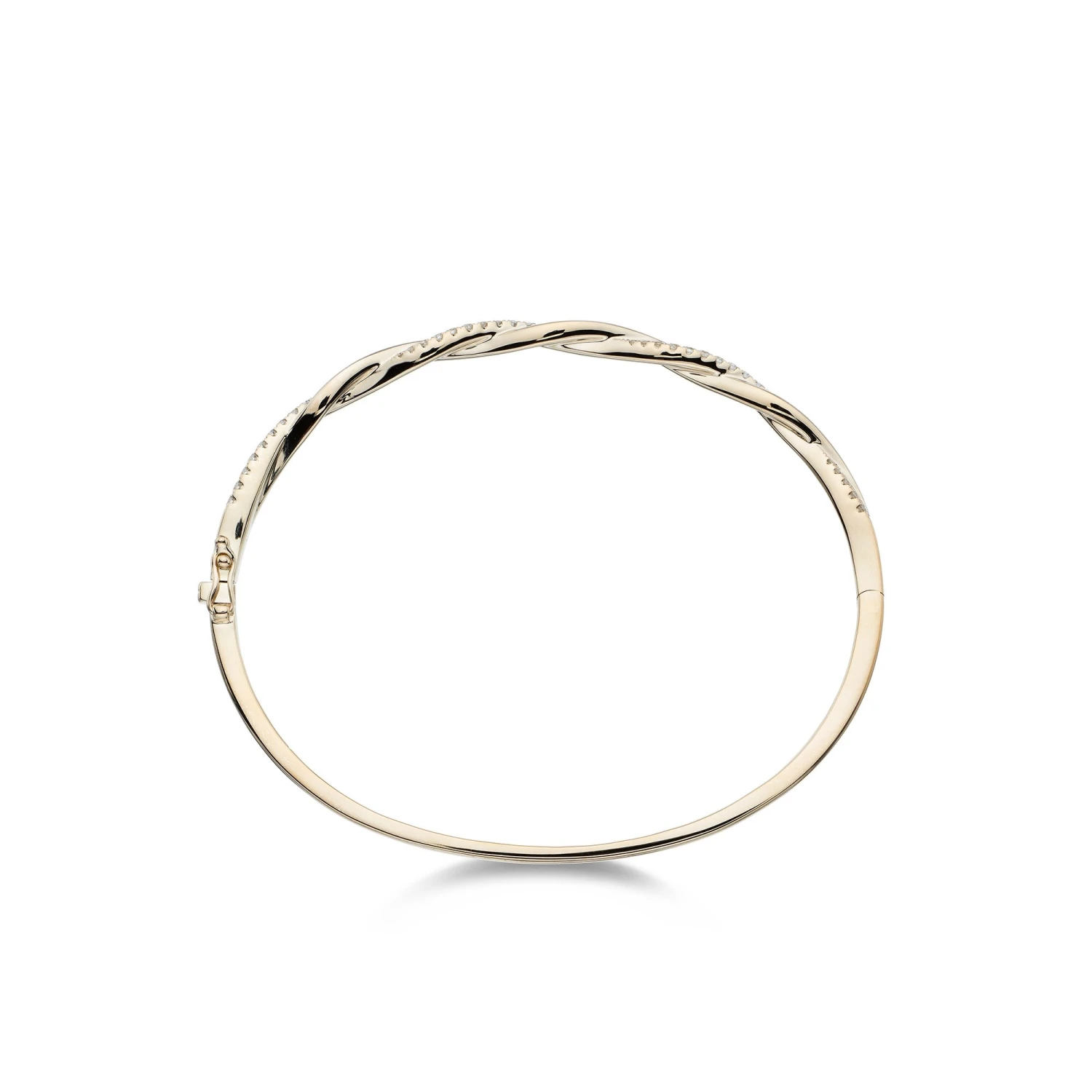 A luxurious and stylish piece of jewellery, this 9ct gold bangle is a perfect finishing touch for any look. A row of 0.40ct diamonds elegantly twists and entwines in an a flowing sparkling design. A must have in any jewellery collection, whether a gift for a loved one or yourself, this will be a welcome addition.