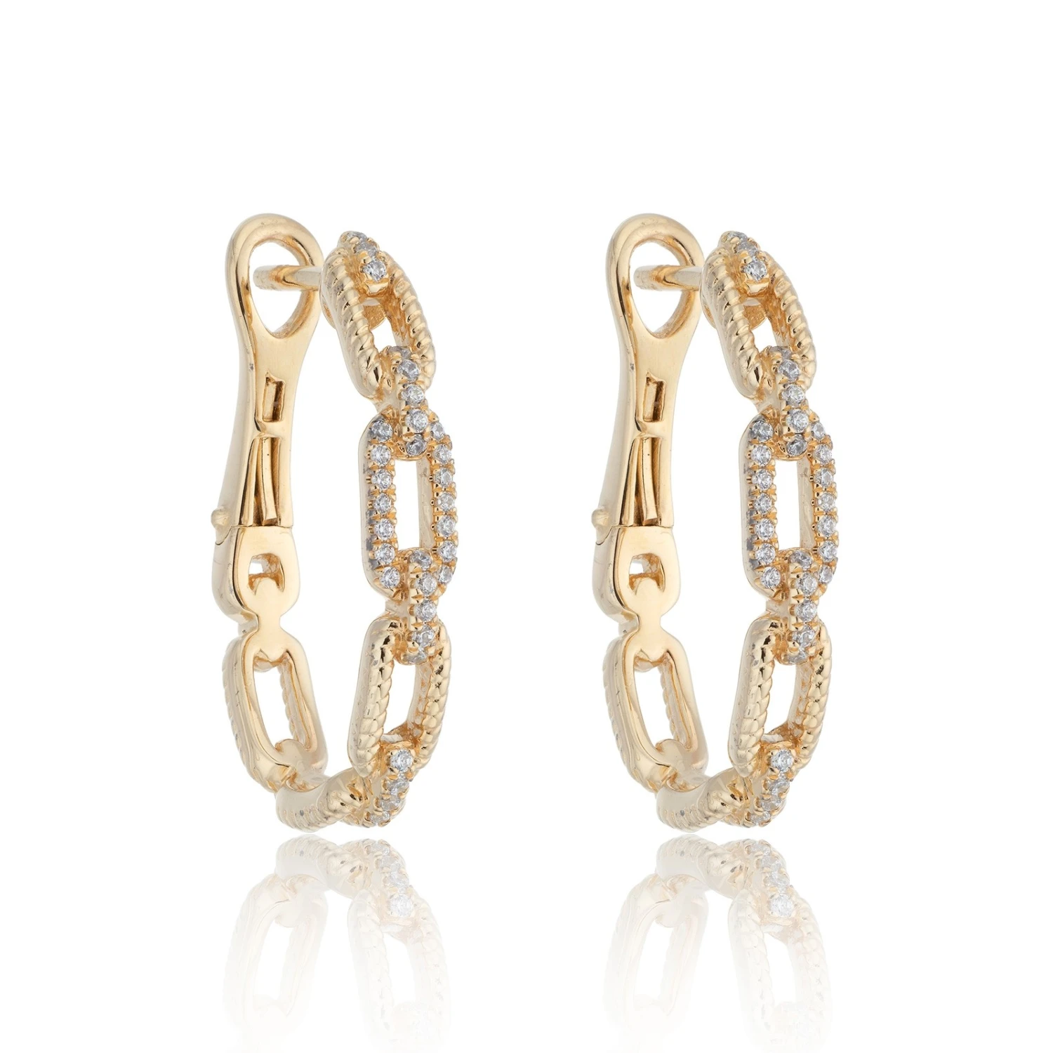 Perfectly transition from a day to night look with these 9ct Yellow Gold 0.23ct Brilliant Cut Diamond Link Hoop Earrings. These stylish earrings are crafted from polished 9ct yellow gold and feature a striking chain link design, adorned with round brilliant cut diamonds. Matching items available – Contact our customer services team for more information. Diamond Information: Stone Colour- G-H, Cut- Brilliant, Total Carat- 0.23ct. Presented in luxury Chisholm Hunter gift packaging.
