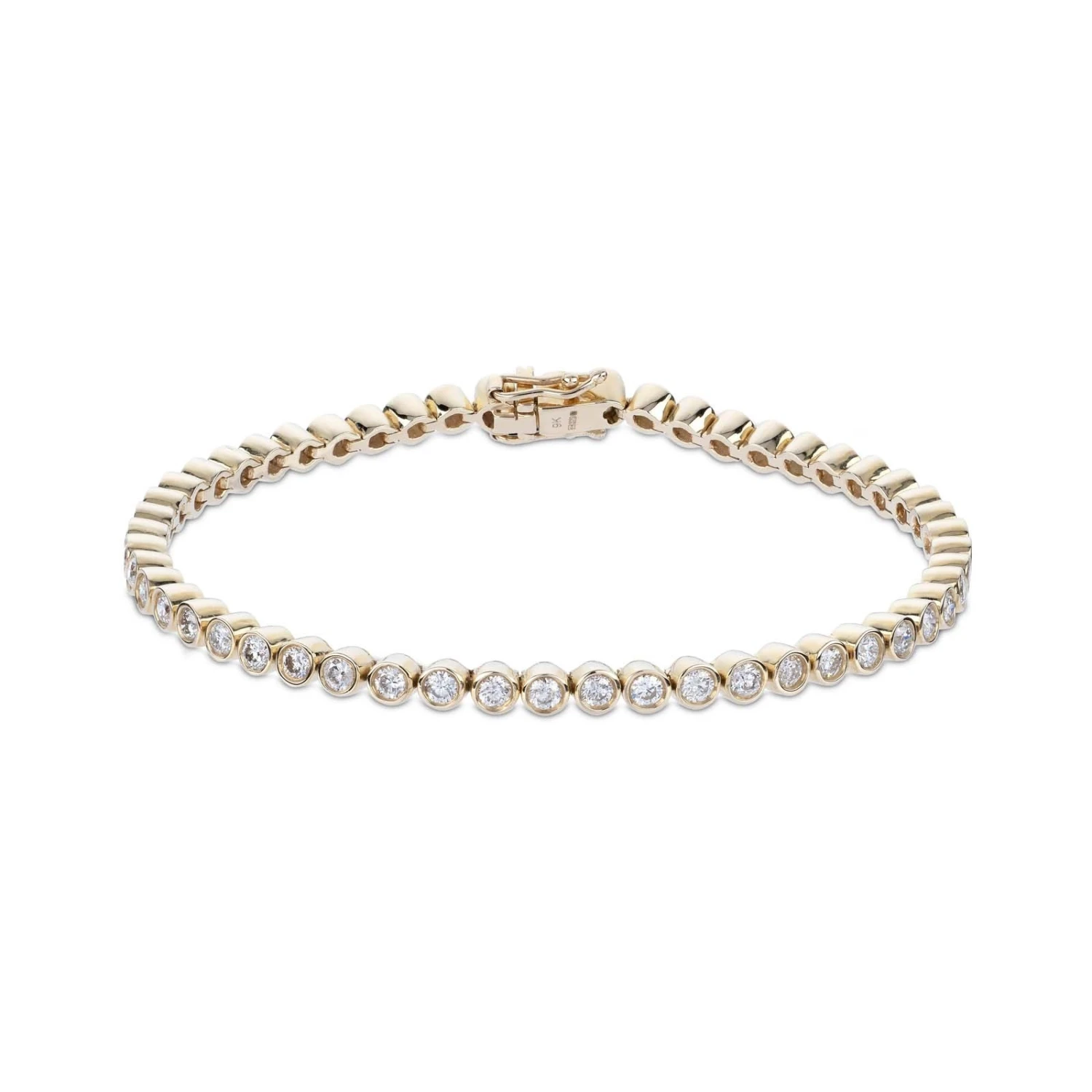 Add some sparkling glamour to all of your special occasions with this 9ct yellow gold diamond bracelet. Wonderfully luxurious, this beautiful bracelet is made up of a sparkling row of 3.00ct round brilliant cut diamonds, set in a rub over setting, that dazzle from every angle. A wonderful additon to any jewellery box, this would be a wonderful gift for a special loved one.