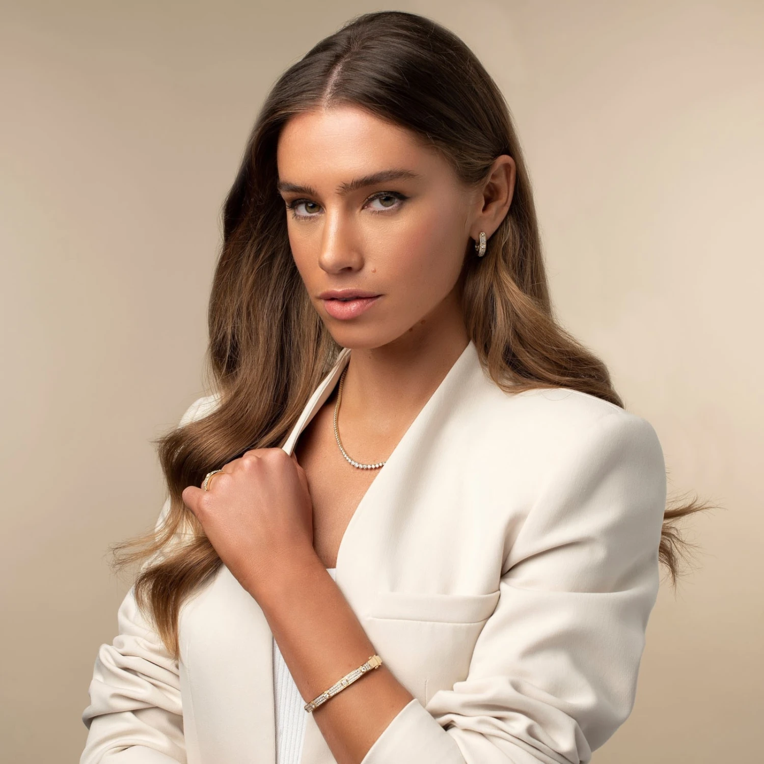 Set in 9ct yellow gold, discover this stunning diamond fancy band ring at Chisholm Hunter today. With three round brilliant cut diamonds accented by pave set brilliant diamonds, this glittering statement ring will instantly elevate any look. Pair with the matching hoop earrings and bangle for a chic set. Diamond Information: Cut – Round Brilliant, Colour – I-J, Clarity – I1, Total Carat – 0.72ct.
