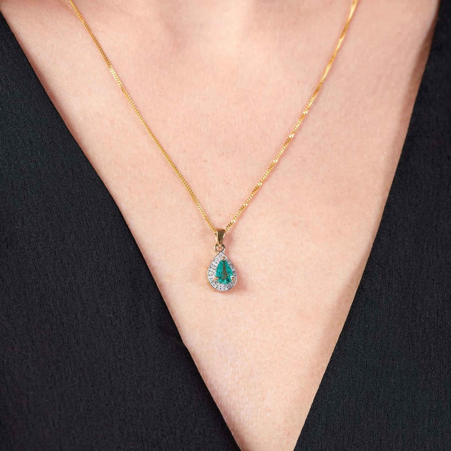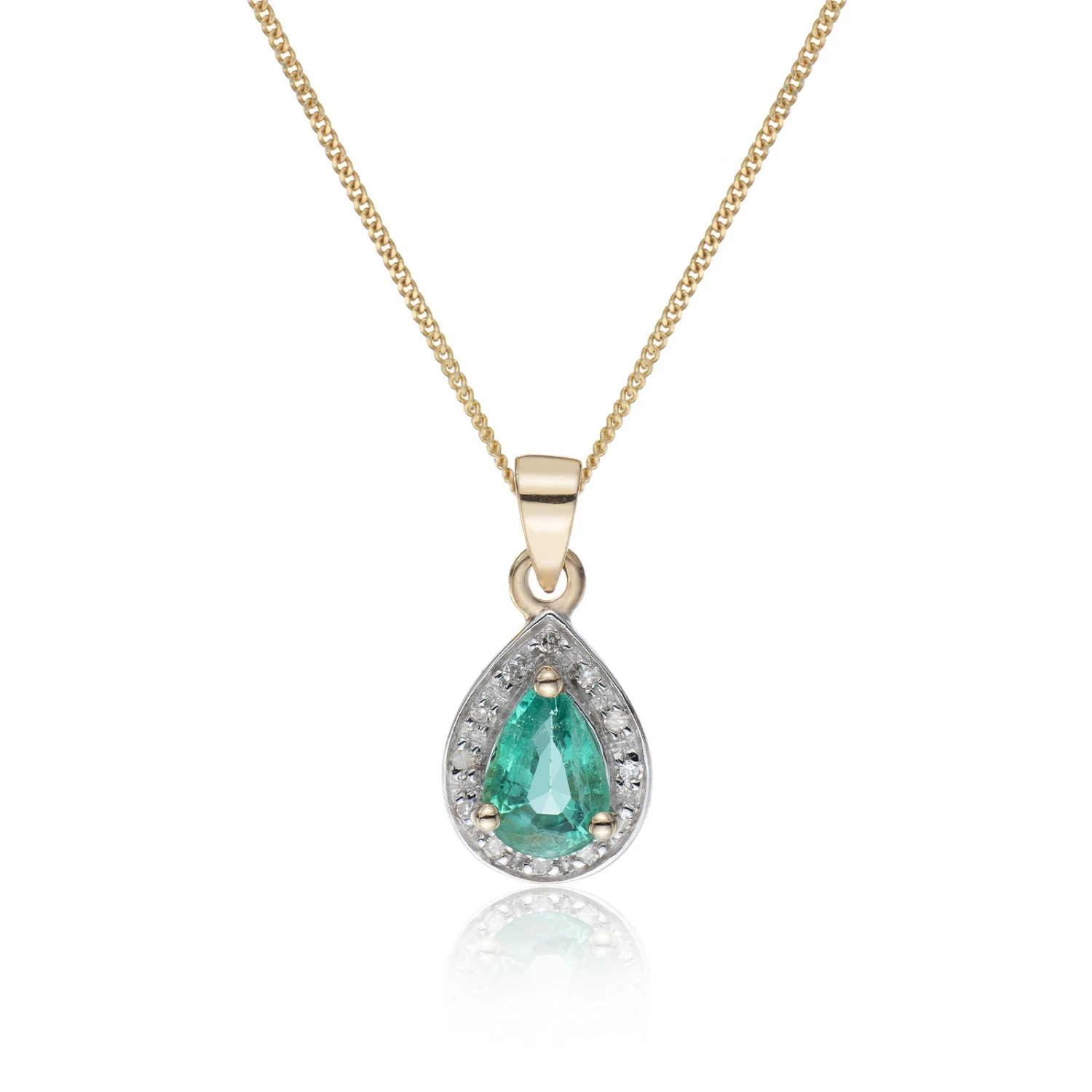 Add jewel-tones to your jewellery box with this 9ct Yellow Gold 0.04ct Diamond and Emerald Halo Pendant from Chisholm Hunter. A stunning pear-shaped emerald set in yellow gold with a double diamond halo makes this piece perfect for styling with your own jewellery or the matching items.