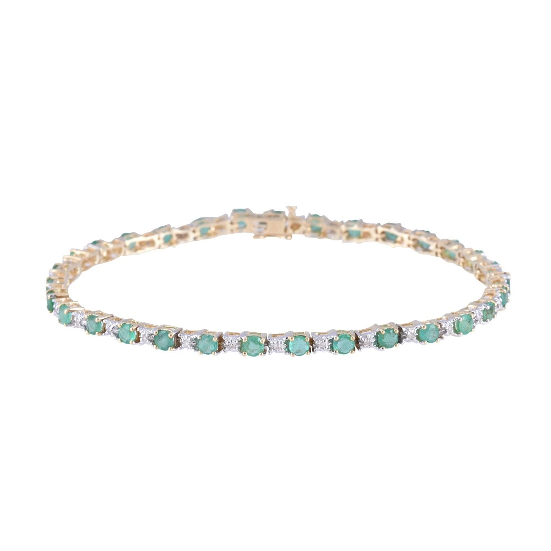 Perfect for complementing a modern and contemporary sense of style, this beautifully eye catching 9ct yellow gold bracelet with round brilliant cut emeralds and diamonds really adds a touch of glamour to all day to evening looks.