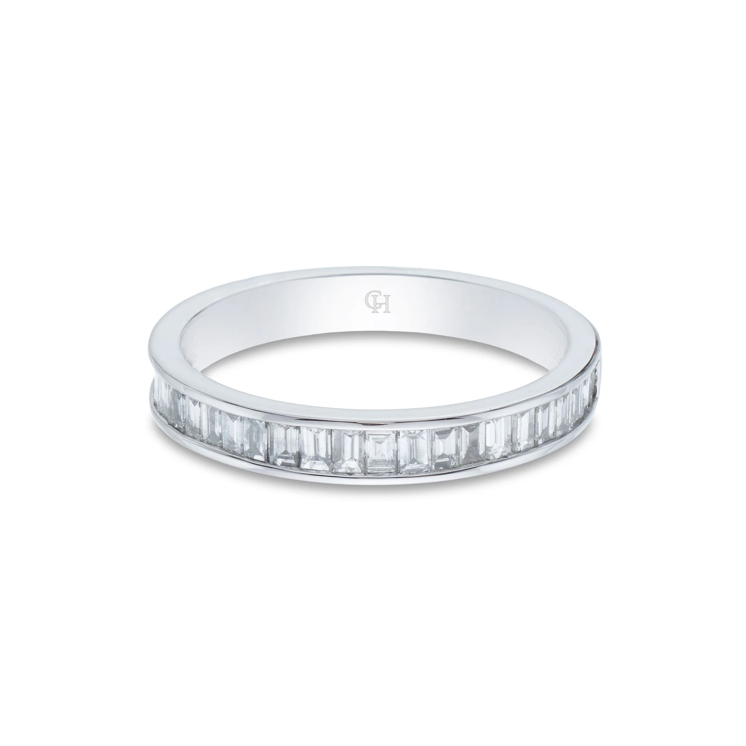 Simply elegant, this breathtaking platinum half diamond eternity wedding ring is the ultimate symbol of your love and devotion for your partner. Perfect for complementing a modern and contemporary sense of style; a row of baguette cut diamonds, with a total carat weight of 0.65, are held in a channel setting in a design that will perfectly compliment existing jewels or worn alone will add a touch of sparkle to your loved one’s hands. Diamond Information: Cut- Baguette Cut, Colour – G-H, Clarity – SI1, Carat Weight – 0.65ct.