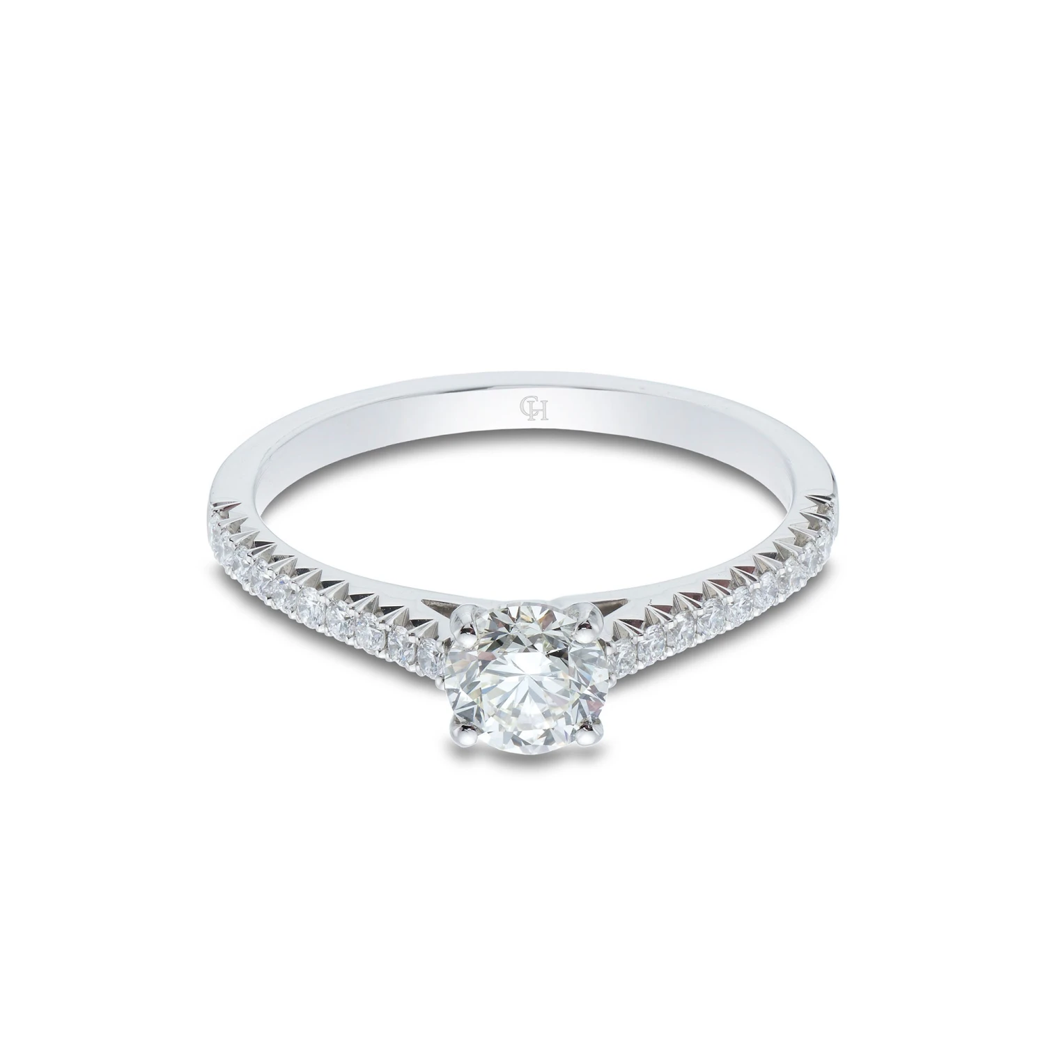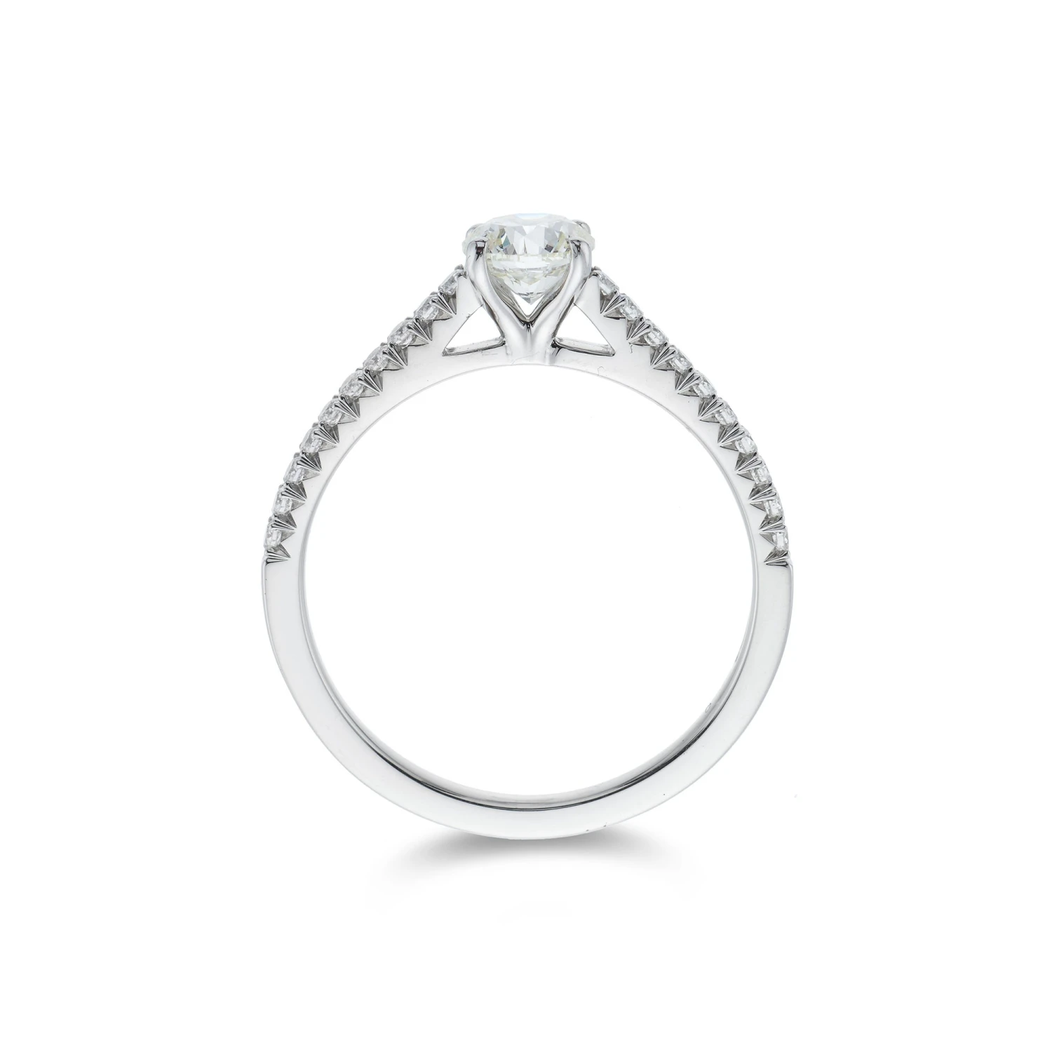 Plan the perfect proposal and begin the next chapter in your love story with this elegant platinum 0.70 total carat weight diamond ring. A single 0.50ct round brilliant diamond solitaire sits on diamond set shoulders, in a sparkling design that is sure to have your loved one falling head over heels in love as you get down on one knee. Diamond Information: Cut – Round Brilliant, Colour – G-H, Clarity – SI1-SI2, Carat Weight – 0.70ct