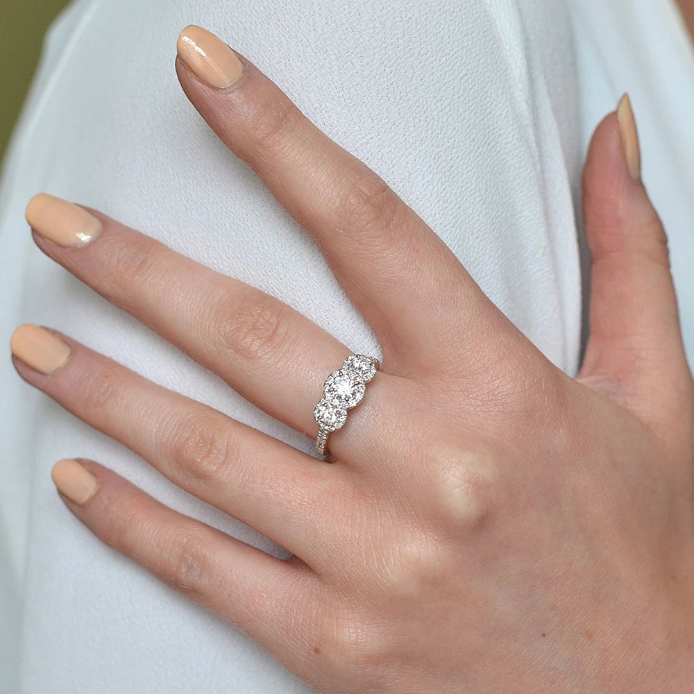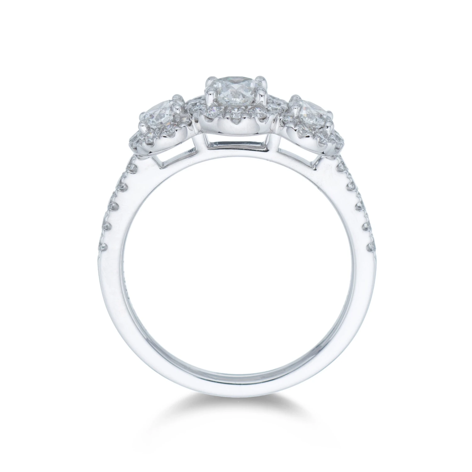 Chisholm Hunter Platinum Brilliant Cut 1.20ct Diamond Halo Three Stone Ring