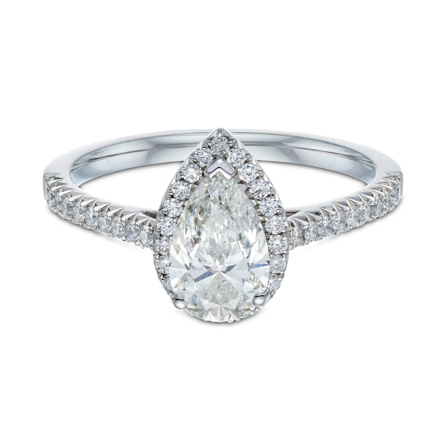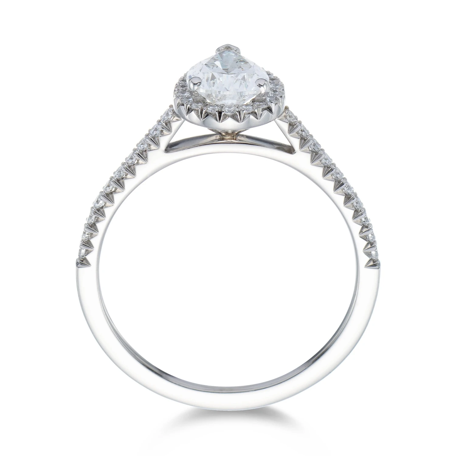 Make your loved one fall in love all over again with this platinum pear cut diamond ring. A wonderful symbol of your commitment, this piece features a feminine pear cut centre diamond enhance by a delicate halo of round brilliant diamonds and diamond set shoulders. With a total diamond weight of 1.00ct, this ring will take your breath away with it’s magnificent sparkle. Diamond Information: Cut- Pear, Colour- G, Clarity- SI2, Carat Weight- 1.00ct.