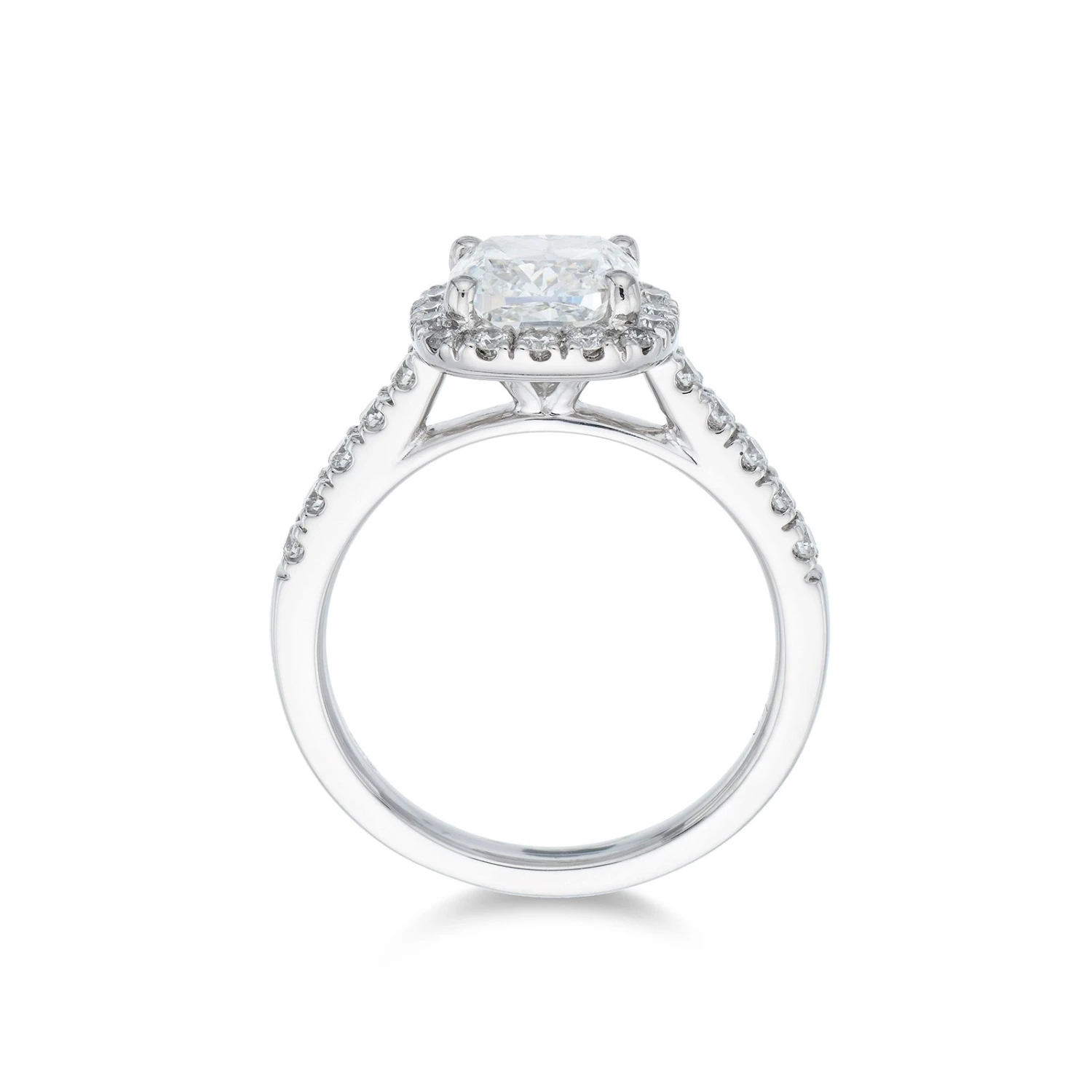 You would be proud to pop the question with this beautiful Platinum 1.50ct Cushion Cut Diamond Halo Solitaire Ring exclusively from Chisholm Hunter. Expertly crafted from certified diamonds, this elegant piece is designed to emit an abundance of light to create a sparkle effect like no other. Surrounded with a platinum band embellished with diamonds- this ring is truly an unforgettable piece of jewellery.