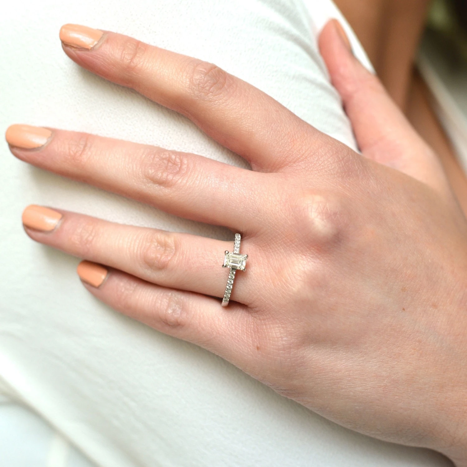 Stunningly simple, this platinum 0.90 total carat weight diamond engagement ring is the perfect way to ask the most imortant question and begin a new chapter of your love story together as a couple. A sparkling emerald cut 0.75ct diamond sits in a claw setting above dazzling diamond set shoulders, a truly romantic design. Diamond Information: Cut – Emerald Cut, Colour – G-H, Clarity – SI1, Carat Weight – 0.90ct.
