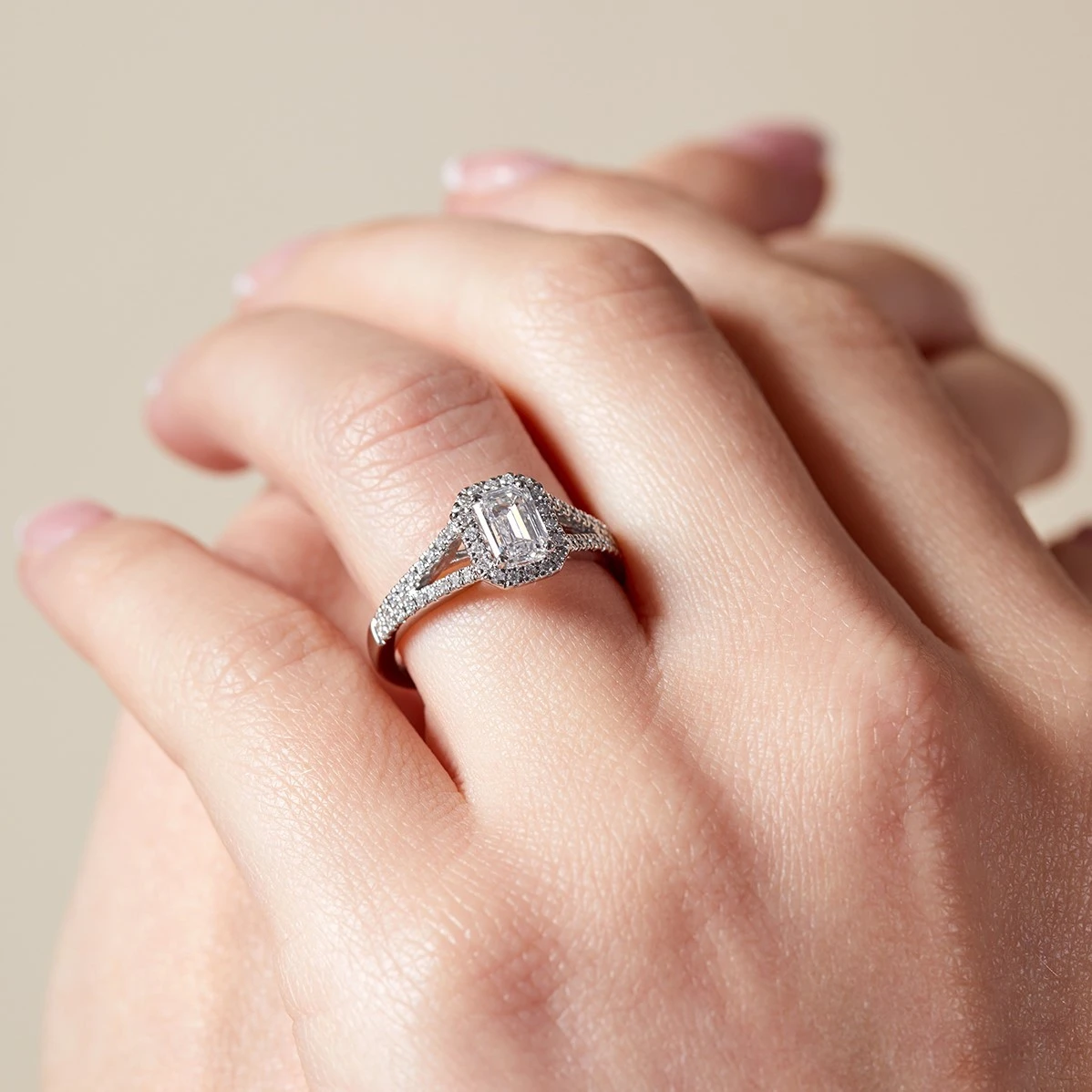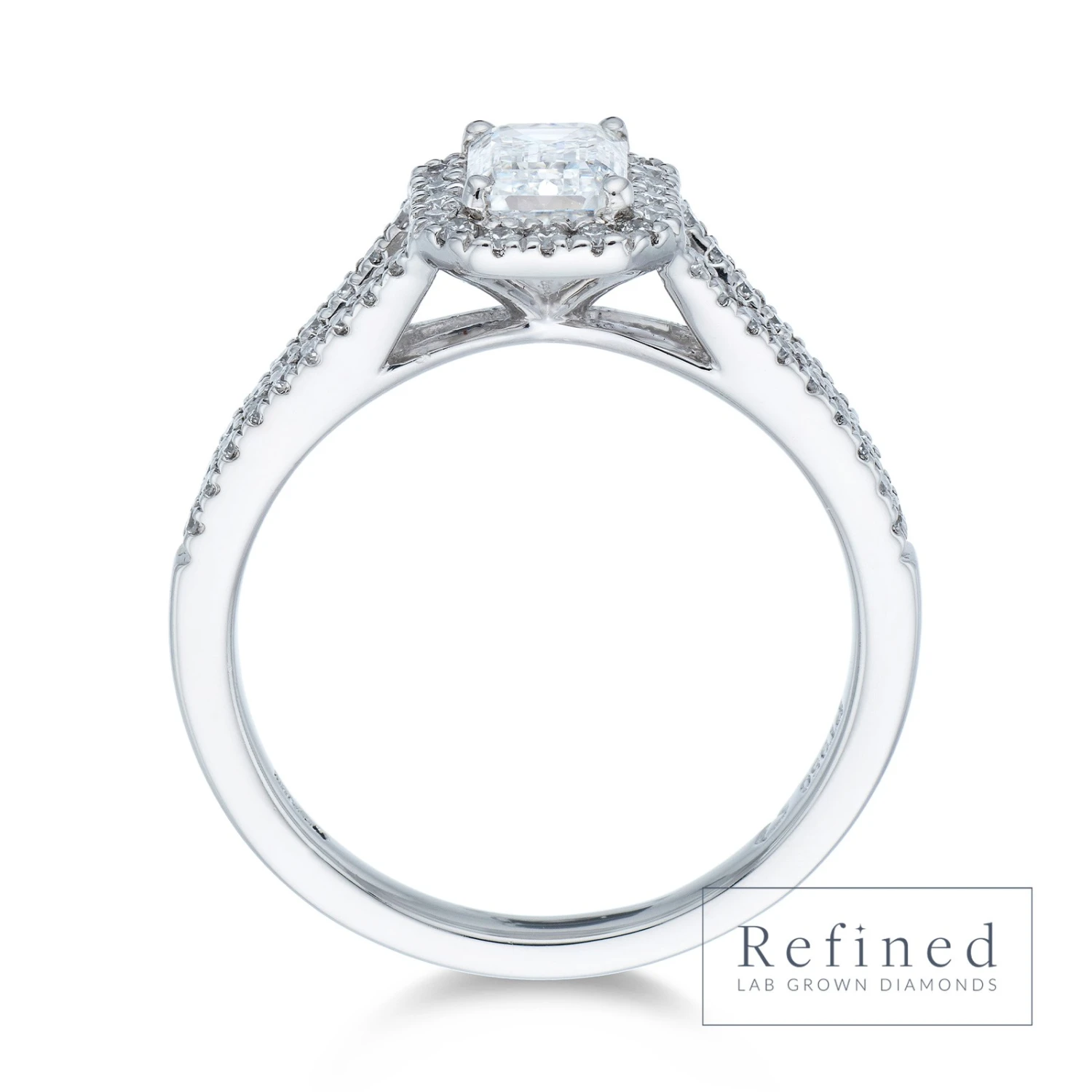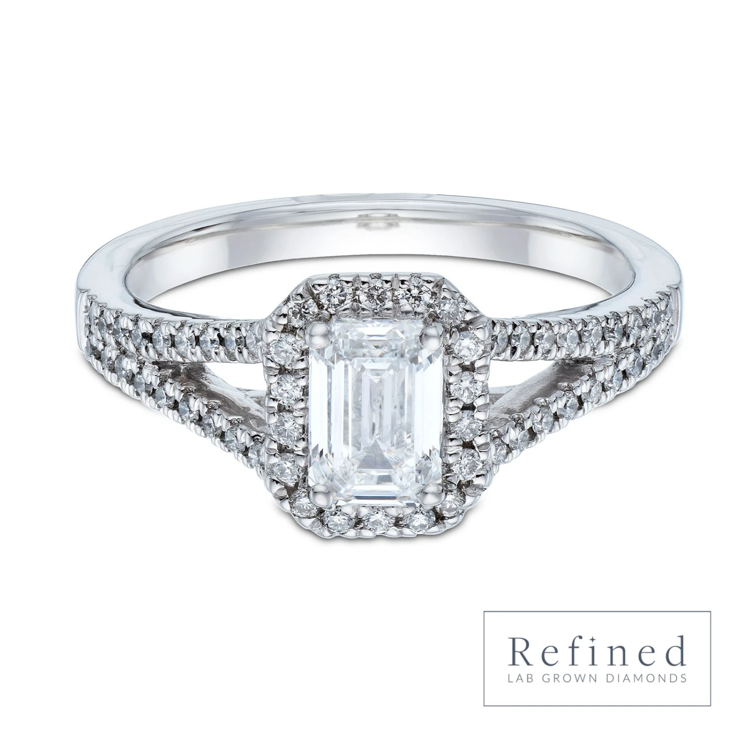 A classically romantic setting, the halo engagement ring is guaranteed to sweep your loved one off their feet. Surrounded by a halo of sparkling lab grown diamonds, four curved prongs caress a breath-taking emerald cut 0.75ct lab grown diamond which is further enhanced by dazzling diamond set shoulders perfect for those who love to sparkle. Presented on a thoughtfully designed platinum band, meticulously perfected for ultimate comfort, discover more lab grown luxury from Chisholm Hunter today.