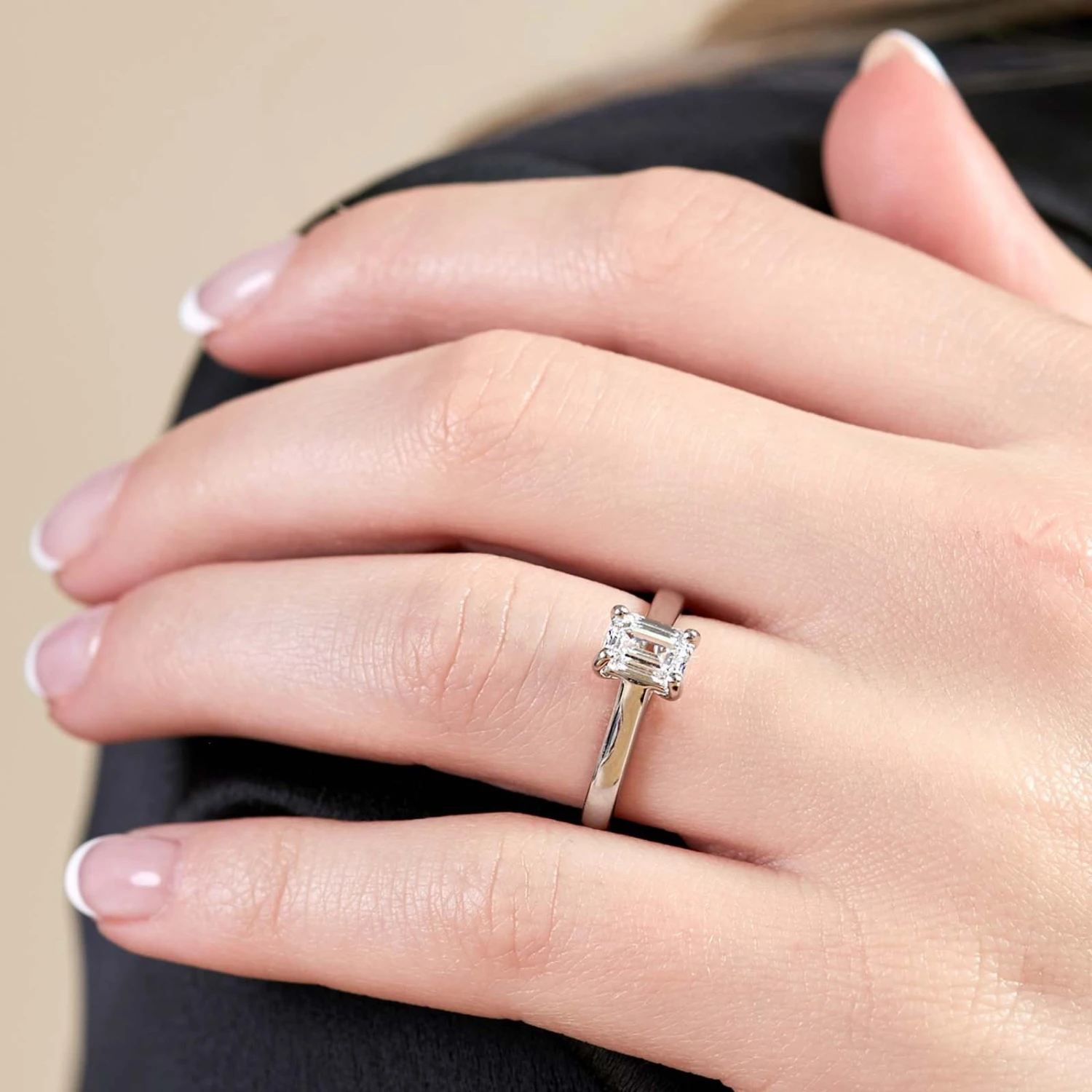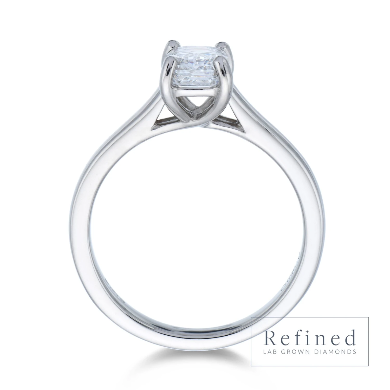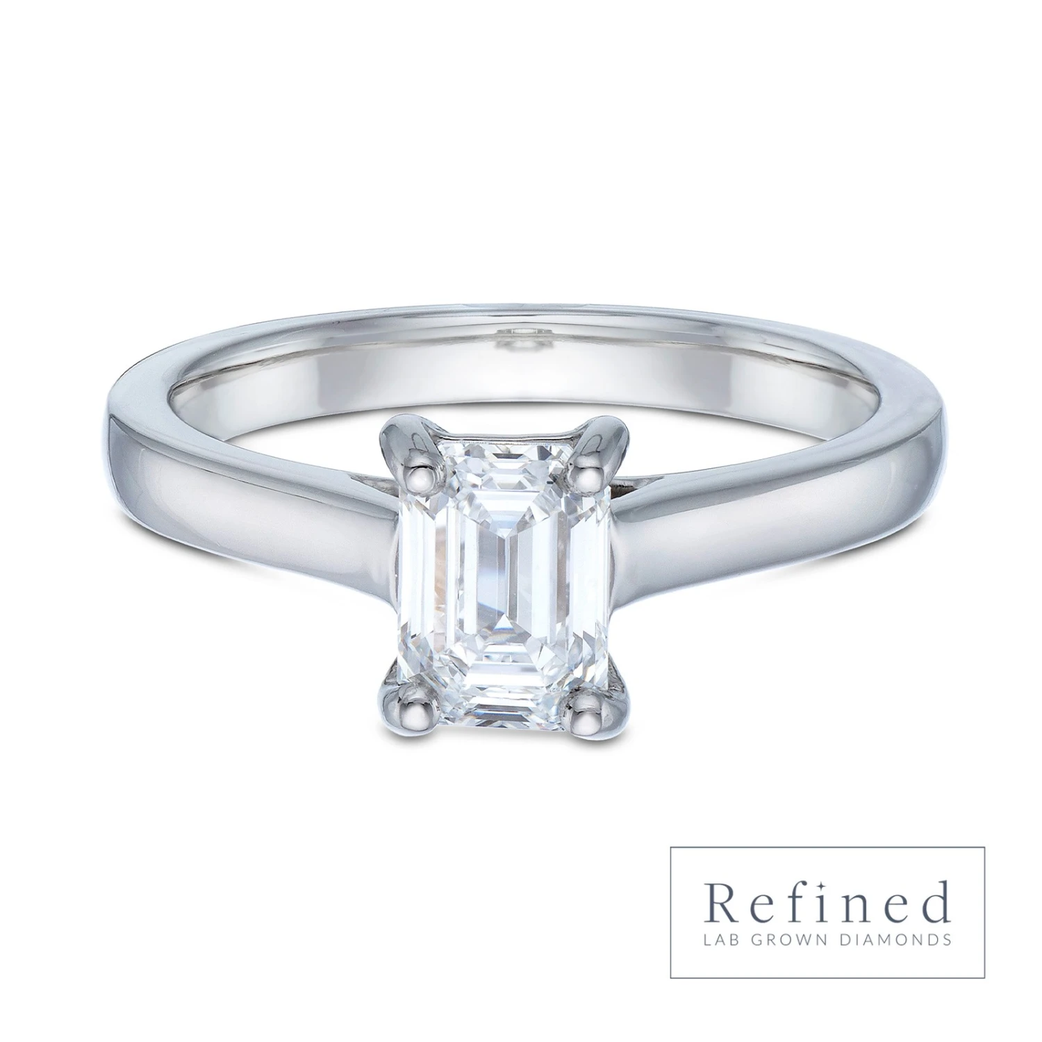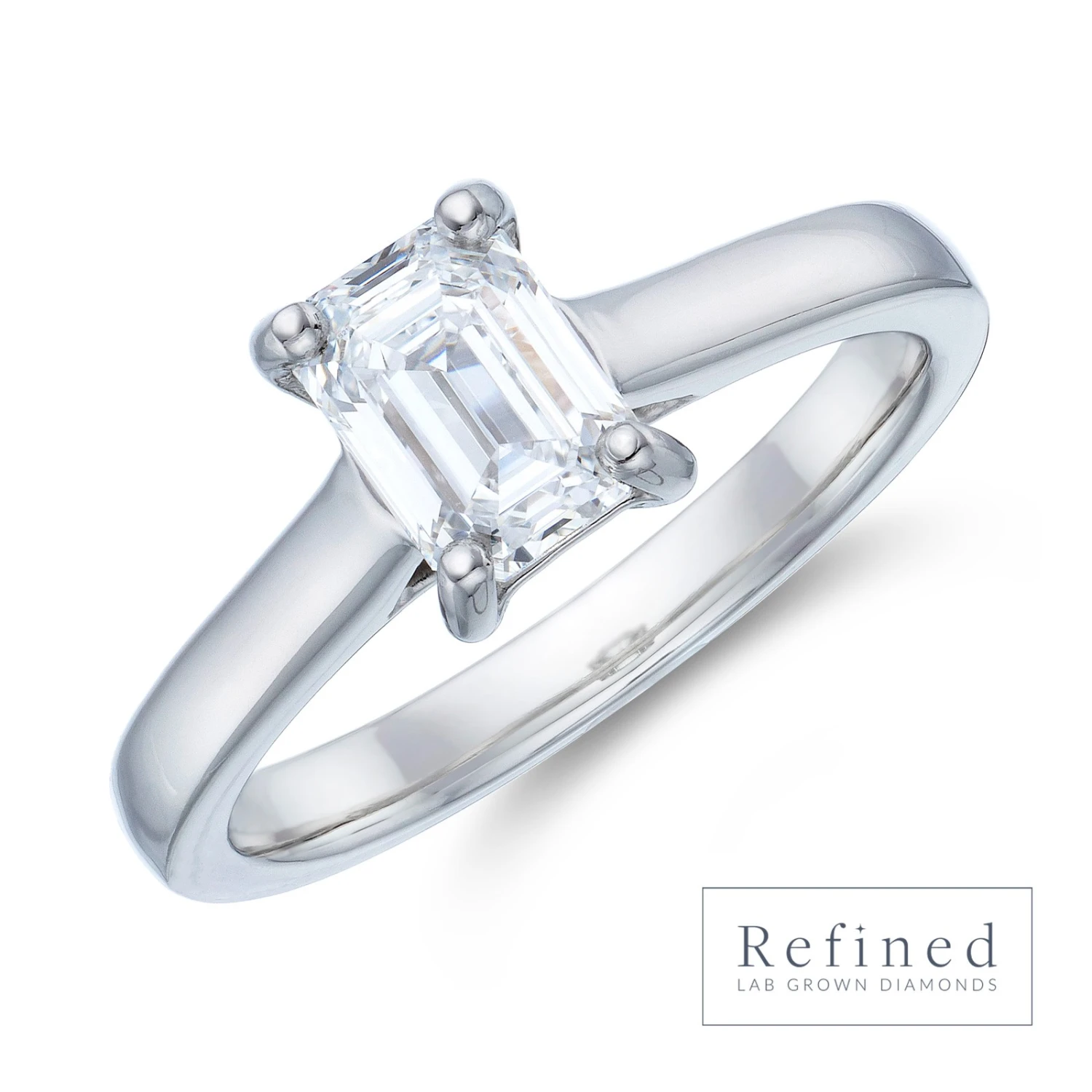 Propose to your one true love with this 1.00ct lab grown emerald cut ring. This sparkling diamond is surrounded by a stylish platinum band creating a timeless silhouette. Diamond Information: Cut- Emerald, Colour- D-G, Clarity- VVS2-VS2, Carat Weight- 1.00ct.
