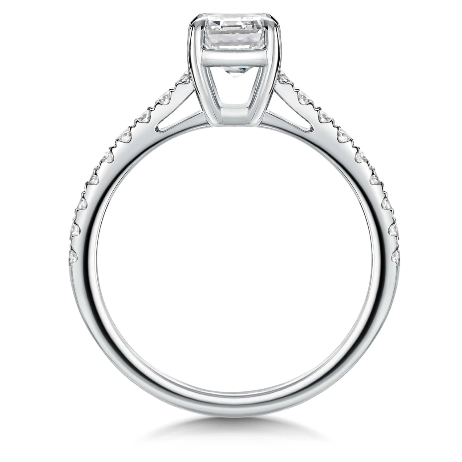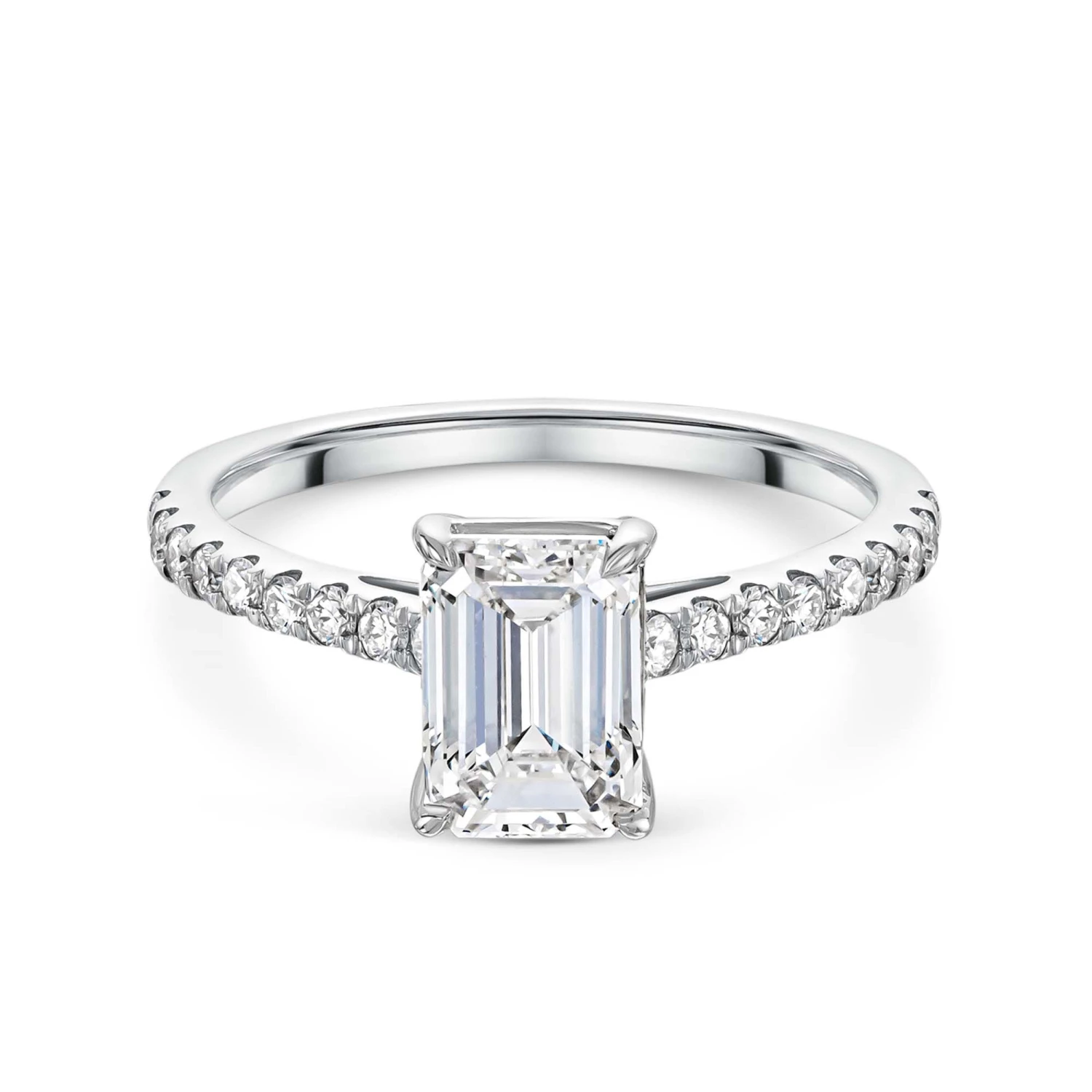 Make it the perfect proposal with the Platinum Lab Grown 1.50ct Emerald Diamond Shoulders Ring, a stunning piece that embodies elegance and sophistication. This exquisite ring showcases the enchanting beauty of a lab-grown emerald-cut diamond, perfectly complemented by shimmering diamond shoulders. The centrepiece of this captivating ring is a lab-grown emerald-cut diamond with a weight of 1.50ct. The emerald cut, with its step-cut facets and elongated shape, accentuates the diamond’s clarity and creates a striking presence. The sparkling diamond shoulders not only add extra glamour and radiance but also create a seamless transition between the centre diamond and the band. Diamond Information: Cut- Emerald, Colour- F-G, Clarity- VS2, Carat- 1.75ct.