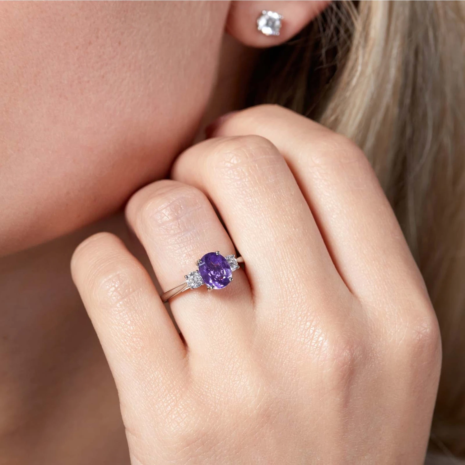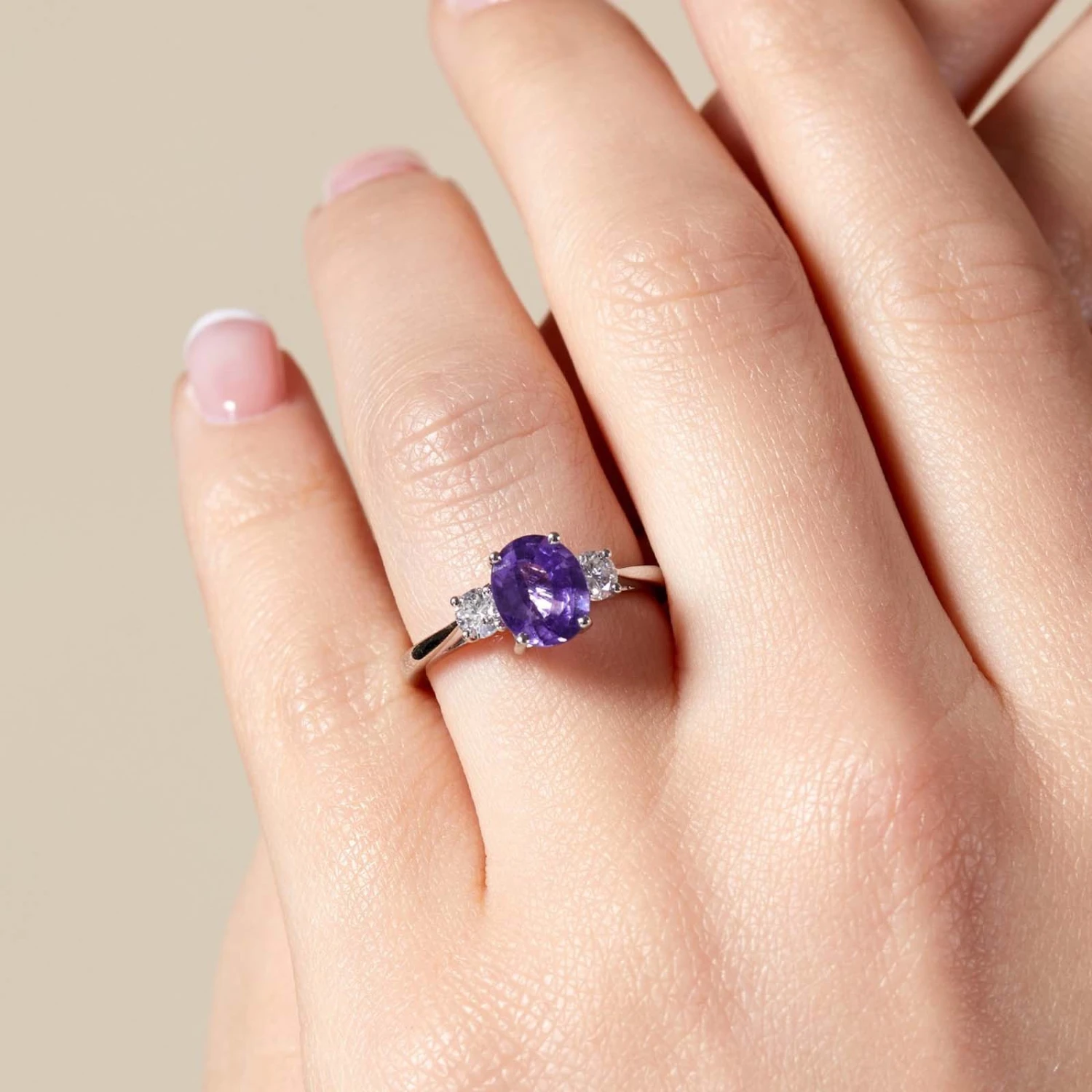 With a captivating purple sapphire stone taking centre stage, this alluring gemstone ring features a polished platinum band. This three stone ring features an oval cut purple sapphire gemstone held inside a four claw setting, complemented by a round brilliant-cut diamond flanking both sides of the gemstone. These diamonds have also been encased within a four-claw mount. In this design, the purple sapphire stone weighs 1.94 carats and the diamonds weigh 0.34 carats.