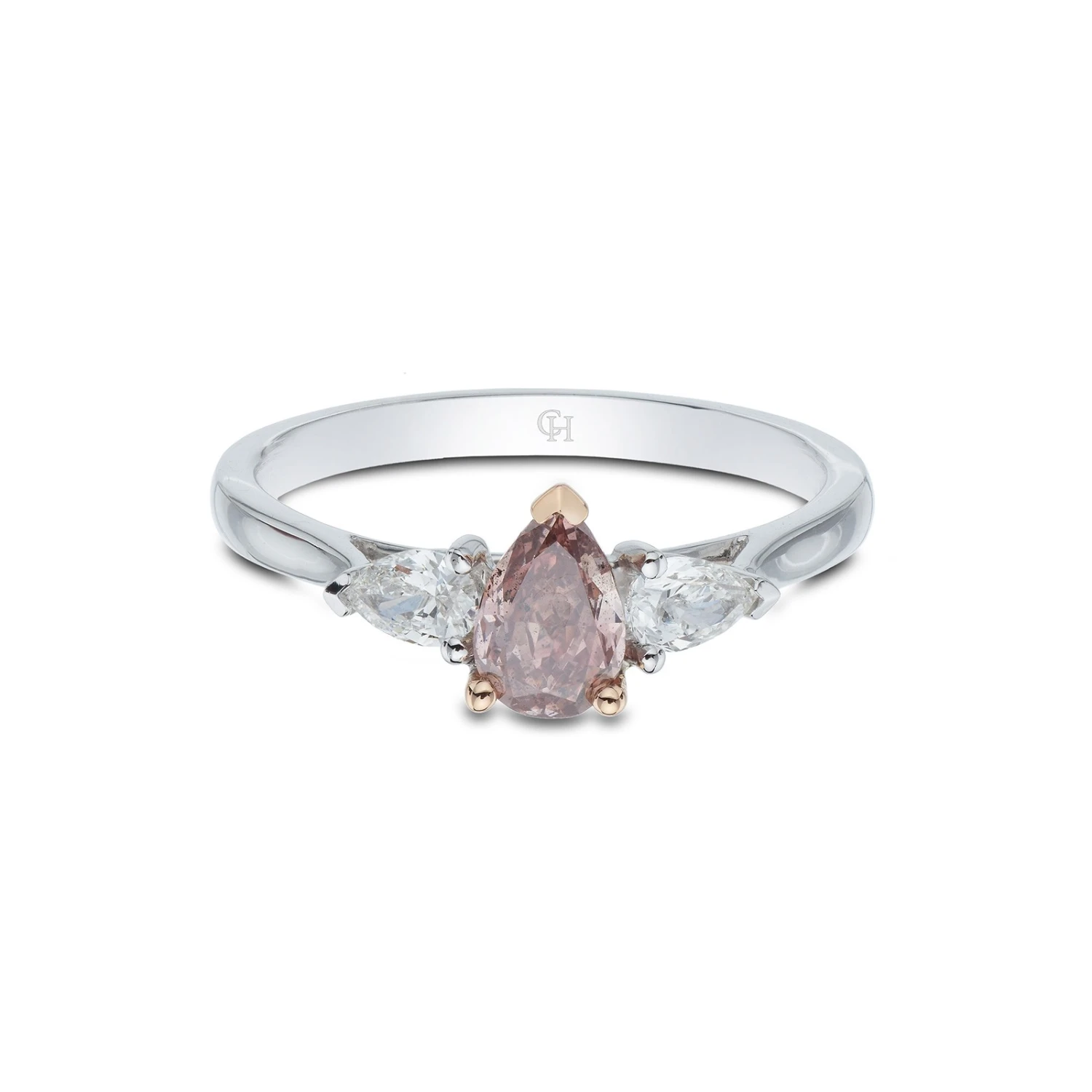 The inviting soft glow of this pink pear cut diamond glistens beautifully against the round brilliant halo cluster. Delicately held with 3 claw detailing, this feminine, romantic look is complete with sparkling, double row diamond shoulders and is set on a smooth & sophisticated mix of white & rose gold ring. Approximately 1.35ct total weight.